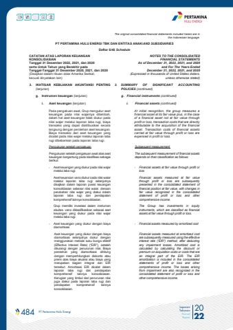 484 PT Pertamina Hulu Energi 2022Laporan TahunanAnnual ReportThe original consolidated financial statements included herein are in the Indonesian language.PT PERTAMINA HULU ENERGI TBK DAN ENTITAS ANAK/AND SUBSIDIARIES Daftar 5/45 ScheduleCATATAN ATAS LAPORAN KEUANGANKONSOLIDASIANTanggal 31 Desember 2022, 2021, dan 2020serta Untuk Tahun yang Berakhir pada Tanggal-Tanggal 31 Desember 2020, 2021, dan 2020(Disajikan dalam ribuan dolar Amerika Serikat, kecuali dinyatakan lain)NOTES TO THE CONSOLIDATEDFINANCIAL STATEMENTSAs of December 31, 2022, 2021, and 2020and For The Years Ended December 31, 2022, 2021, and 2020(Expressed in thousands of United States dollars,unless otherwise stated)3. IKHTISAR KEBIJAKAN AKUNTANSI PENTING (lanjutan)3. SUMMARY OF SIGNIFICANT ACCOUNTING POLICIES (continued)g. Instrumen keuangan (lanjutan) g. Financial instruments (continued)i. Aset keuangan (lanjutan) i. Financial assets (continued)Pada pengakuan awal, Grup mengukur aset keuangan pada nilai wajarnya ditambah, dalam hal aset keuangan tidak diukur pada nilai wajar melalui laporan laba rugi, biaya transaksi yang dapat diatribusikan secara langsung dengan perolehan aset keuangan. Biaya transaksi dari aset keuangan yang dicatat pada nilai wajar melalui laporan laba rugi dibebankan pada laporan laba rugi.At initial recognition, the group measures a financial asset at its fair value plus, in the case of a financial asset not at fair value through profit or loss, transaction costs that are directly attributable to the acquisition of the financial asset. Transaction costs of financial assets carried at fair value through profit or loss are expensed in profit or loss.Pengukuran setelah pengakuan Subsequent measurementPengukuran setelah pengakuan awal atas aset keuangan bergantung pada klasifikasi sebagai berikut:The subsequent measurement of financial assets depends on their classification as follows:- Aset keuangan yang diukur pada nilai wajar melalui laba rugi- Financial assets at fair value through profit or lossAset keuangan yang diukur pada nilai wajar melalui laporan laba rugi selanjutnya disajikan dalam laporan posisi keuangan konsolidasian sebesar nilai wajar, dengan perubahan nilai wajar yang diakui dalam laporan laba rugi dan pendapatan komprehensif lainnya konsolidasian.Financial assets measured at fair value through profit or loss are subsequently presented in the consolidated statement of financial position at fair value, with changes in fair value recognized in the consolidated statement of profit or loss and other comprehensive income.Grup memiliki investasi dalam instrumen ekuitas, yang diklasifikasikan sebagai aset keuangan yang diukur pada nilai wajar melalui laba rugi.The Group has investments in equity instruments, which are classified as financial assets at fair value through profit or loss.- Aset keuangan yang diukur dengan biaya diamortisasi- Financial assets measured by amortized costAset keuangan yang diukur dengan biaya diamortisasi selanjutnya diukur dengan menggunakan metode suku bunga efektif (Effective Interest Rate) (%u201cEIR%u201d), setelah dikurangi dengan penurunan nilai. Biaya perolehan yang diamortisasi dihitung dengan memperhitungkan diskonto atau premi atas biaya akuisisi atau biaya yang merupakan bagian integral dari EIR tersebut. Amortisasi EIR dicatat dalam laporan laba rugi dan pendapatan komprehensif lainnya konsolidasian. Kerugian yang timbul dari penurunan nilai juga diakui pada laporan laba rugi dan pendapatan komprehensif lainnya konsolidasian.Financial assets measured at amortized cost are subsequently measured using the effective interest rate (%u201cEIR%u201d) method, after deducting any impairment losses. Amortized cost is calculated by calculating the discount or premium on acquisition costs or costs that are an integral part of the EIR. The EIR amortization is included in the consolidated statements of profit or loss and other comprehensive income. The losses arising from impairment are also recognized in the consolidated statement of profit or loss and other comprehensive income.