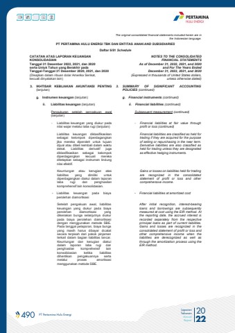 490 PT Pertamina Hulu Energi 2022Laporan TahunanAnnual ReportThe original consolidated financial statements included herein are in the Indonesian language.PT PERTAMINA HULU ENERGI TBK DAN ENTITAS ANAK/AND SUBSIDIARIES Daftar 5/51 ScheduleCATATAN ATAS LAPORAN KEUANGANKONSOLIDASIANTanggal 31 Desember 2022, 2021, dan 2020serta Untuk Tahun yang Berakhir pada Tanggal-Tanggal 31 Desember 2020, 2021, dan 2020(Disajikan dalam ribuan dolar Amerika Serikat, kecuali dinyatakan lain)NOTES TO THE CONSOLIDATEDFINANCIAL STATEMENTSAs of December 31, 2022, 2021, and 2020and For The Years Ended December 31, 2022, 2021, and 2020(Expressed in thousands of United States dollars,unless otherwise stated)3. IKHTISAR KEBIJAKAN AKUNTANSI PENTING(lanjutan)3. SUMMARY OF SIGNIFICANT ACCOUNTINGPOLICIES (continued)g. Instrumen keuangan (lanjutan) g. Financial instruments (continued)ii. Liabilitas keuangan (lanjutan) ii. Financial liabilities (continued)Pengukuran setelah pengakuan awal(lanjutan)Subsequent measurement (continued)- Liabilitas keuangan yang diukur padanilai wajar melalui laba rugi (lanjutan)- Financial liabilities at fair value throughprofit or loss (continued)Liabilitas keuangan diklasifikasikansebagai kelompok diperdagangkanjika mereka diperoleh untuk tujuandijual atau dibeli kembali dalam waktudekat. Liabilitas derivatif juga diklasifikasikan sebagai kelompok diperdagangkan kecuali mereka ditetapkan sebagai instrumen lindung nilai efektif.Financial liabilities are classified as held fortrading if they are acquired for the purposeof selling or repurchasing in the near term.Derivative liabilities are also classified asheld for trading unless they are designatedas effective hedging instruments.Keuntungan atau kerugian atas liabilitas yang dimiliki untuk diperdagangkan diakui dalam laporan laba rugi dan penghasilan komprehensif lain konsolidasian.Gains or losses on liabilities held for trading are recognized in the consolidated statement of profit or loss and other comprehensive income.- Liabilitas keuangan pada biayaperolehan diamortisasi- Financial liabilities at amortized costSetelah pengakuan awal, liabilitaskeuangan yang diukur pada biayaperolehan diamortisasi yangdikenakan bunga selanjutnya diukurpada biaya perolehan diamortisasidengan menggunakan metode SBE.Pada tanggal pelaporan, biaya bungayang masih harus dibayar dicatatsecara terpisah dari pokok pinjamanterkait dalam bagian liabilitas lancar.Keuntungan dan kerugian diakuidalam laporan laba rugi danpenghasilan komprehensif lain konsolidasian ketika liabilitas dihentikan pengakuannya serta melalui proses amortisasi menggunakan metode SBE.After initial recognition, interest-bearing loans and borrowings are subsequently measured at cost using the EIR method. At the reporting date, the accrued interest is recorded separately from the respective principal loans as part of current liabilities. Gains and losses are recognized in the consolidated statement of profit or loss and other comprehensive income when the liabilities are derecognized as well as through the amortization process using the EIR method.