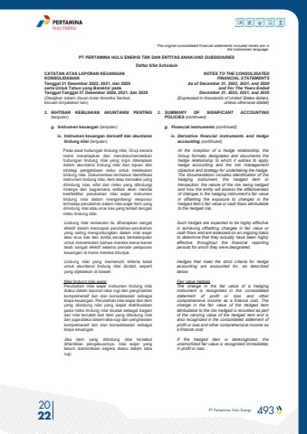 PT Pertamina Hulu Energi 493 2022The original consolidated financial statements included herein are in the Indonesian language.PT PERTAMINA HULU ENERGI TBK DAN ENTITAS ANAK/AND SUBSIDIARIES Daftar 5/54 ScheduleCATATAN ATAS LAPORAN KEUANGANKONSOLIDASIANTanggal 31 Desember 2022, 2021, dan 2020serta Untuk Tahun yang Berakhir pada Tanggal-Tanggal 31 Desember 2020, 2021, dan 2020(Disajikan dalam ribuan dolar Amerika Serikat, kecuali dinyatakan lain)NOTES TO THE CONSOLIDATEDFINANCIAL STATEMENTSAs of December 31, 2022, 2021, and 2020and For The Years Ended December 31, 2022, 2021, and 2020(Expressed in thousands of United States dollars,unless otherwise stated)3. IKHTISAR KEBIJAKAN AKUNTANSI PENTING (lanjutan)3. SUMMARY OF SIGNIFICANT ACCOUNTING POLICIES (continued)g. Instrumen keuangan (lanjutan) g. Financial instruments (continued)iv. Instrumen keuangan derivatif dan akuntansi lindung nilai (lanjutan)iv. Derivative financial instruments and hedge accounting (continued)Pada awal hubungan lindung nilai, Grup secara resmi menetapkan dan mendokumentasikan hubungan lindung nilai yang ingin diterapkan dalam akuntansi lindung nilai dan tujuan dan strategi pengelolaan risiko untuk melakukan lindung nilai. Dokumentasi termasuk identifikasi instrumen lindung nilai, item atau transaksi yang dilindung nilai, sifat dari risiko yang dilindungi nilainya dan bagaimana entitas akan menilai keefektifan perubahan nilai wajar instrumen lindung nilai dalam mengimbangi eksposur terhadap perubahan dalam nilai wajar item yang dilindung nilai atau arus kas yang terkait dengan risiko lindung nilai.At the inception of a hedge relationship, the Group formally designates and documents the hedge relationship to which it wishes to apply hedge accounting and the risk management objective and strategy for undertaking the hedge. The documentation includes identification of the hedging instrument, the hedged item or transaction, the nature of the risk being hedged and how the entity will assess the effectiveness of changes in the hedging instrument%u2019s fair value in offsetting the exposure to changes in the hedged item%u2019s fair value or cash flows attributable to the hedged risk.Lindung nilai semacam itu diharapkan sangat efektif dalam mencapai perubahan-perubahan yang saling menguntungkan dalam nilai wajar atau arus kas dan dinilai secara berkelanjutan untuk menentukan bahwa mereka benar-benar telah sangat efektif selama periode pelaporan keuangan di mana mereka ditunjuk. Lindung nilai yang memenuhi kriteria ketat untuk akuntansi lindung nilai dicatat, seperti yang dijelaskan di bawah:Such hedges are expected to be highly effective in achieving offsetting changes in fair value or cash flows and are assessed on an ongoing basis to determine that they actually have been highly effective throughout the financial reporting periods for which they were designated.Hedges that meet the strict criteria for hedge accounting are accounted for, as described beloNilai lindung nilai wajarPerubahan nilai wajar instrumen lindung nilai diakui dalam laporan laba rugi dan penghasilan komprehensif lain dan konsolidasian sebagai biaya keuangan. Perubahan nilai wajar dari item yang dilindung nilai yang dapat diatribusikan pada risiko lindung nilai dicatat sebagai bagian dari nilai tercatat dari item yang dilindung nilai dan juga diakui dalam laba rugi dan penghasilan komprehensif lain dan konsolidasian sebagai biaya keuangan.Fair value hedgesThe change in the fair value of a hedging instrument is recognized in the consolidated statement of profit or loss and other comprehensive income as a finance cost. The change in the fair value of the hedged item attributable to the risk hedged is recorded as part of the carrying value of the hedged item and is also recognized in the consolidated statement of profit or loss and other comprehensive income as a finance cost.Jika item yang dilindung nilai tersebut dihentikan pengakuannya, nilai wajar yang belum diamortisasi segera diakui dalam laba rugi.If the hedged item is derecognized, the unamortized fair value is recognized immediately in profit or loss.