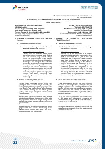 PT Pertamina Hulu Energi 495 2022The original consolidated financial statements included herein are in the Indonesian language.PT PERTAMINA HULU ENERGI TBK DAN ENTITAS ANAK/AND SUBSIDIARIES Daftar 5/56 ScheduleCATATAN ATAS LAPORAN KEUANGANKONSOLIDASIANTanggal 31 Desember 2022, 2021, dan 2020serta Untuk Tahun yang Berakhir pada Tanggal-Tanggal 31 Desember 2020, 2021, dan 2020(Disajikan dalam ribuan dolar Amerika Serikat, kecuali dinyatakan lain)NOTES TO THE CONSOLIDATEDFINANCIAL STATEMENTSAs of December 31, 2022, 2021, and 2020and For The Years Ended December 31, 2022, 2021, and 2020(Expressed in thousands of United States dollars,unless otherwise stated)3. IKHTISAR KEBIJAKAN AKUNTANSI PENTING (lanjutan)3. SUMMARY OF SIGNIFICANT ACCOUNTING POLICIES (continued)g. Instrumen keuangan (lanjutan) g. Financial instruments (continued)iv. Instrumen keuangan derivatif dan akuntansi lindung nilai (lanjutan)iv. Derivative financial instruments and hedge accounting (continued)Lindung nilai dari investasi bersihLindung nilai dari investasi bersih dalam operasi luar negeri, termasuk suatu lindung nilai item moneter yang dicatat sebagai bagian dari investasi bersih, dicatat dengan cara yang mirip dengan lindung nilai arus kas. Keuntungan atau kerugian dari instrumen lindung nilai terkait dengan bagian efektif dari lindung nilai diakui sebagai OCI sementara keuntungan atau kerugian terkait bagian yang tidak efektif diakui dalam laporan laba rugi dan penghasilan komprehensif lain konsolidasian. Pada saat pelepasan operasi luar negeri, nilai kumulatif dari setiap keuntungan atau kerugian yang dicatat dalam ekuitas ditransfer ke laba rugi.Hedges of a net investmentHedges of a net investment in a foreign operation, including a hedge of a monetary item that is accounted for as part of the net investment, are accounted for in a way similar to cash flow hedges. Gains or losses on the hedging instrument relating to the effective portion of the hedge are recognized as OCI while any gains or losses relating to the ineffective portion are recognized in the consolidated statement of profit or loss and other comprehensive income. On disposal of the foreign operation, the cumulative value of any such gains or losses recorded in equity is transferred to the profit or loss.h. Piutang usaha dan piutang lain-lainPiutang usaha merupakan jumlah tagihan dari pelanggan atas penjualan minyak mentah, gas bumi, jasa pengeboran, jasa penunjang migas serta jasa distribusi dan logistik energi dalam kegiatan usaha normal. Piutang lain-lain adalah jumlah piutang pihak ketiga atau pihak berelasi di luar kegiatan usaha.h. Trade receivables and other receivablesTrade receivables are amounts due from customers for crude oil, natural gas sales, drilling services, oil and gas support services and energy distribution and logistics services in the ordinary course of business. Other receivables are amounts due from third orrelated parties for transactions beyond the ordinarycourse of business.Piutang usaha dan piutang lain-lain pada awalnya diakui sebesar nilai wajar dan selanjutnya diukur pada biaya perolehan diamortisasi dengan menggunakan metode bunga efektif, dikurangi dengan provisi untuk penurunan nilai.Bila pembayaran diharapkan akan diterima dalamjangka waktu satu periode atau kurang, makadiklasifikasikan sebagai aset lancar. Bila tidak,disajikan sebagai aset tidak lancar.Trade and other receivables are recognized initially at fair value and subsequently measured at amortized cost using the effective interest method, less provision for impairment.If collection is expected in one period or less, they are classified as current assets. If not, they are presented as non-current assets.