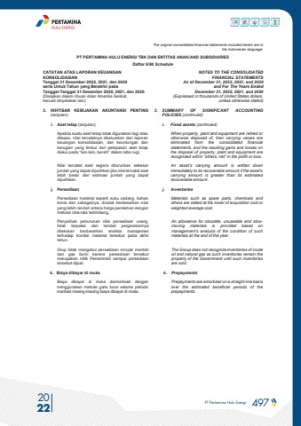 PT Pertamina Hulu Energi 497 2022The original consolidated financial statements included herein are in the Indonesian language.PT PERTAMINA HULU ENERGI TBK DAN ENTITAS ANAK/AND SUBSIDIARIES Daftar 5/58 ScheduleCATATAN ATAS LAPORAN KEUANGANKONSOLIDASIANTanggal 31 Desember 2022, 2021, dan 2020serta Untuk Tahun yang Berakhir pada Tanggal-Tanggal 31 Desember 2020, 2021, dan 2020(Disajikan dalam ribuan dolar Amerika Serikat, kecuali dinyatakan lain)NOTES TO THE CONSOLIDATEDFINANCIAL STATEMENTSAs of December 31, 2022, 2021, and 2020and For The Years Ended December 31, 2022, 2021, and 2020(Expressed in thousands of United States dollars,unless otherwise stated)3. IKHTISAR KEBIJAKAN AKUNTANSI PENTING (lanjutan)3. SUMMARY OF SIGNIFICANT ACCOUNTING POLICIES (continued)i. Aset tetap (lanjutan) i. Fixed assets (continued)Apabila suatu aset tetap tidak digunakan lagi atau dilepas, nilai tercatatnya dikeluarkan dari laporan keuangan konsolidasian, dan keuntungan dan kerugian yang timbul dari pelepasan aset tetap diakui pada %u201clain-lain, bersih%u201d dalam laba rugi.When property, plant and equipment are retired or otherwise disposed of, their carrying values are eliminated from the consolidated financial statements, and the resulting gains and losses on the disposal of property, plant and equipment are recognized within %u201cothers, net%u201d in the profit or loss.Nilai tercatat aset segera diturunkan sebesar jumlah yang dapat dipulihkan jika nilai tercatat aset lebih besar dari estimasi jumlah yang dapat dipulihkan.An asset%u2019s carrying amount is written down immediately to its recoverable amount if the asset%u2019s carrying amount is greater than its estimated recoverable amount.j. Persediaan j. InventoriesPersediaan material seperti suku cadang, bahan kimia dan sebagainya, dicatat berdasarkan nilai yang lebih rendah antara harga perolehan dengan metode rata-rata tertimbang.Materials such as spare parts, chemicals and others are stated at the lower of acquisition cost or weighted average cost.Penyisihan penurunan nilai persediaan usang, tidak terpakai dan lambat pergerakannya dilakukan berdasarkan analisis manajemen terhadap kondisi material tersebut pada akhir tahun.An allowance for obsolete, unuseable and slowmoving materials is provided based on management%u2019s analysis of the condition of such materials at the end of the year.Grup tidak mengakui persediaan minyak mentah dan gas bumi karena persediaan tersebut merupakan milik Pemerintah sampai persediaantersebut dijual.The Group does not recognize inventories of crude oil and natural gas as such inventories remain the property of the Government until such inventories are sold.k. Biaya dibayar di muka k. PrepaymentsBiaya dibayar di muka diamortisasi dengan menggunakan metode garis lurus selama periode manfaat masing-masing biaya dibayar di muka.Prepayments are amortized on a straight-line basis over the estimated beneficial periods of the prepayments.