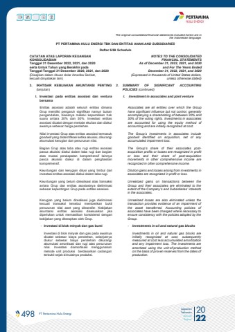 498 PT Pertamina Hulu Energi 2022Laporan TahunanAnnual ReportThe original consolidated financial statements included herein are in the Indonesian language.PT PERTAMINA HULU ENERGI TBK DAN ENTITAS ANAK/AND SUBSIDIARIES Daftar 5/59 ScheduleCATATAN ATAS LAPORAN KEUANGANKONSOLIDASIANTanggal 31 Desember 2022, 2021, dan 2020serta Untuk Tahun yang Berakhir pada Tanggal-Tanggal 31 Desember 2020, 2021, dan 2020(Disajikan dalam ribuan dolar Amerika Serikat, kecuali dinyatakan lain)NOTES TO THE CONSOLIDATEDFINANCIAL STATEMENTSAs of December 31, 2022, 2021, and 2020and For The Years Ended December 31, 2022, 2021, and 2020(Expressed in thousands of United States dollars,unless otherwise stated)3. IKHTISAR KEBIJAKAN AKUNTANSI PENTING(lanjutan)3. SUMMARY OF SIGNIFICANT ACCOUNTINGPOLICIES (continued)l. Investasi pada entitas asosiasi dan venturabersamal. Investment in associates and joint ventureEntitas asosiasi adalah seluruh entitas dimanaGrup memiliki pengaruh signifikan namun bukanpengendalian, biasanya melalui kepemilikan haksuara antara 20% dan 50%. Investasi entitasasosiasi dicatat dengan metode ekuitas dan diakuiawalnya sebesar harga perolehan.Nilai investasi Grup atas entitas asosiasi termasukgoodwill yang diidentifikasi ketika akuisisi, dikurangi akumulasi kerugian dan penurunan nilai.Associates are all entities over which the Group have significant influence but not control, generally accompanying a shareholding of between 20% and 50% of the voting rights. Investments in associates are accounted for using the equity method of accounting and are initially recognized at cost. The Group%u2019s investments in associates include goodwill identified on acquisition, net of any accumulated impairment loss.Bagian Grup atas laba atau rugi entitas asosiasipasca akuisisi diakui dalam laba rugi dan bagianatas mutasi pendapatan komprehensif lainnyapasca akuisisi diakui di dalam penghasilankomprehensif.The Group%u2019s share of their associates postacquisition profits or losses are recognized in profit or loss and their share of post-acquisition movements in other comprehensive income are recognized in other comprehensive income.Keuntungan dan kerugian dilusi yang timbul dariinvestasi entitas asosiasi diakui dalam laba rugi.Dilution gains and losses arising from investments in associates are recognized in profit or loss.Keuntungan yang belum direalisasi atas transaksiantara Grup dan entitas asosiasinya dieliminasisebesar kepentingan Grup pada entitas asosiasi.Kerugian yang belum direalisasi juga dieliminasi kecuali transaksi tersebut memberikan bukti penurunan nilai aset yang ditransfer. Kebijakan akuntansi entitas asosiasi disesuaikan jika diperlukan untuk memastikan konsistensi dengan kebijakan yang diterapkan oleh Grup.Unrealized gains on transactions between the Group and their associates are eliminated to the extent of the Company%u2019s and Subsidiaries%u2019 interests in the associates. Unrealized losses are also eliminated unless the transaction provides evidence of an impairment of the asset transferred. Accounting policies of associates have been changed where necessary to ensure consistency with the policies adopted by the Group.- Investasi di blok minyak dan gas bumi - Investments in oil and natural gas blocksInvestasi di blok minyak dan gas pada awalnyadicatat sebesar biaya perolehan, selanjutnyadiukur sebesar biaya perolehan dikurangiakumulasi amortisasi dan rugi atas penurunannilai. Investasi diamortisasi menggunakanmetode unit produksi berdasarkan cadanganterbukti sejak dimulainya produksi.Investments in oil and natural gas blocks areinitially recognized at cost, subsequentlymeasured at cost less accumulated amortizationand any impairment loss. The investments areamortized using the unit-of-production methodon the basis of proven reserves from the dates of production.