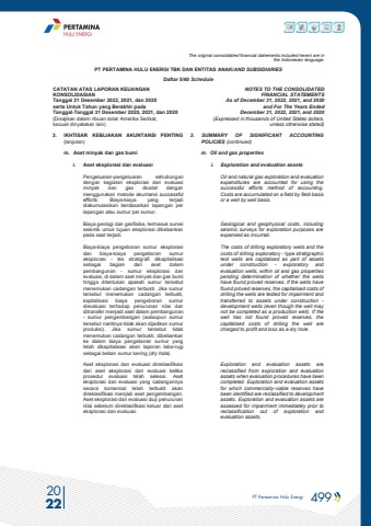 PT Pertamina Hulu Energi 499 2022The original consolidated financial statements included herein are in the Indonesian language.PT PERTAMINA HULU ENERGI TBK DAN ENTITAS ANAK/AND SUBSIDIARIES Daftar 5/60 ScheduleCATATAN ATAS LAPORAN KEUANGANKONSOLIDASIANTanggal 31 Desember 2022, 2021, dan 2020serta Untuk Tahun yang Berakhir pada Tanggal-Tanggal 31 Desember 2020, 2021, dan 2020(Disajikan dalam ribuan dolar Amerika Serikat, kecuali dinyatakan lain)NOTES TO THE CONSOLIDATEDFINANCIAL STATEMENTSAs of December 31, 2022, 2021, and 2020and For The Years Ended December 31, 2022, 2021, and 2020(Expressed in thousands of United States dollars,unless otherwise stated)3. IKHTISAR KEBIJAKAN AKUNTANSI PENTING (lanjutan)3. SUMMARY OF SIGNIFICANT ACCOUNTING POLICIES (continued)m. Aset minyak dan gas bumi m. Oil and gas propertiesi. Aset eksplorasi dan evaluasi i. Exploration and evaluation assets Pengeluaran-pengeluaran sehubungan dengan kegiatan eksplorasi dan evaluasi minyak dan gas dicatat dengan menggunakan metode akuntansi successful efforts. Biaya-biaya yang terjadi diakumulasikan berdasarkan lapangan per lapangan atau sumur per sumur.Oil and natural gas exploration and evaluation expenditures are accounted for using the successful efforts method of accounting. Costs are accumulated on a field by field basis or a well by well basis.Biaya geologi dan geofisika, termasuk survei seismik untuk tujuan eksplorasi dibebankan pada saat terjadi.Geological and geophysical costs, including seismic surveys for exploration purposes are expensed as incurred.Biaya-biaya pengeboran sumur eksplorasi dan biaya-biaya pengeboran sumureksplorasi - tes stratigrafi dikapitalisasi sebagai bagian dari aset dalam pembangunan - sumur eksplorasi dan evaluasi, di dalam aset minyak dan gas bumi hingga ditentukan apakah sumur tersebut menemukan cadangan terbukti. Jika sumur tersebut menemukan cadangan terbukti, kapitalisasi biaya pengeboran sumur dievaluasi terhadap penurunan nilai dan ditransfer menjadi aset dalam pembangunan- sumur pengembangan (walaupun sumur tersebut nantinya tidak akan dijadikan sumur produksi). Jika sumur tersebut tidak menemukan cadangan terbukti, dibebankan ke dalam biaya pengeboran sumur yang telah dikapitalisasi akan laporan laba-rugi sebagai beban sumur kering (dry hole).The costs of drilling exploratory wells and the costs of drilling exploratory - type stratigraphictest wells are capitalised as part of assets under construction - exploratory and evaluation wells, within oil and gas properties pending determination of whether the wells have found proved reserves. If the wells have found proved reserves, the capitalised costs of drilling the wells are tested for impairment and transferred to assets under construction - development wells (even though the well may not be completed as a production well). If the well has not found proved reserves, the capitalised costs of drilling the well are charged to profit and loss as a dry hole.Aset eksplorasi dan evaluasi direklasifikasi dari aset eksplorasi dan evaluasi ketika prosedur evaluasi telah selesai. Aset eksplorasi dan evaluasi yang cadangannya secara komersial telah terbukti akan direklasifikasi menjadi aset pengembangan. Aset eksplorasi dan evaluasi diuji penurunan nilai sebelum direklasifikasi keluar dari aset eksplorasi dan evaluasi.Exploration and evaluation assets are reclassified from exploration and evaluation assets when evaluation procedures have been completed. Exploration and evaluation assets for which commercially-viable reserves have been identified are reclassified to development assets. Exploration and evaluation assets are assessed for impairment immediately prior to reclassification out of exploration and evaluation assets.
