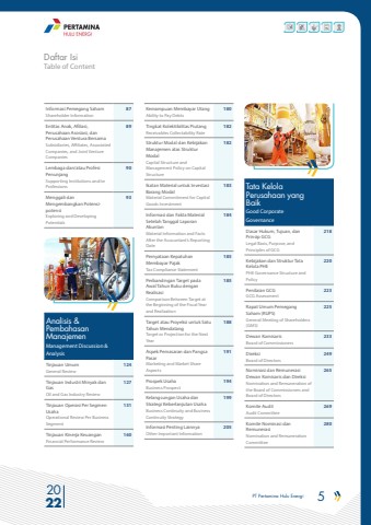 PT Pertamina Hulu Energi 5 2022Analisis & Pembahasan ManajemenManagement Discussion & AnalysisTinjauan UmumGeneral Review124Tinjauan Industri Minyak dan GasOil and Gas Industry Review127Tinjauan Operasi Per SegmenUsahaOperational Review Per BusinessSegment131Tinjauan Kinerja KeuanganFinancial Performance Review160Tata Kelola Perusahaan yang BaikGood Corporate GovernanceDasar Hukum, Tujuan, dan Prinsip GCGLegal Basis, Purpose, and Principles of GCG218Kebijakan dan Struktur Tata Kelola PHEPHE Governance Structure and Policy220Penilaian GCGGCG Assessment223Rapat Umum Pemegang Saham (RUPS)General Meeting of Shareholders (GMS)225Dewan KomisarisBoard of Commissioners233DireksiBoard of Directors249Nominasi dan RemunerasiDewan Komisaris dan DireksiNomination and Remuneration of the Board of Commissioners and Board of Directors265Komite AuditAudit Committee269Komite Nominasi danRemunerasiNomination and RemunerationCommittee280Informasi Pemegang SahamShareholder Information87Entitas Anak, Afiliasi, Perusahaan Asosiasi, dan Perusahaan Ventura BersamaSubsidiaries, Affiliates, Associated Companies, and Joint Venture Companies89Lembaga dan/atau Profesi PenunjangSupporting Institutions and/or Professions90Menggali dan Mengembangkan PotensipotensiExploring and Developing Potentials93Table of ContentDaftar IsiKemampuan Membayar UtangAbility to Pay Debts180Tingkat Kolektibilitas PiutangReceivables Collectability Rate182Struktur Modal dan Kebijakan Manajemen atas Struktur ModalCapital Structure and Management Policy on Capital Structure182Ikatan Material untuk Investasi Barang ModalMaterial Commitment for Capital Goods Investment183Informasi dan Fakta Material Setelah Tanggal Laporan AkuntanMaterial Information and Facts After the Accountant%u2019s Reporting Date184Pernyataan Kepatuhan Membayar PajakTax Compliance Statement185Perbandingan Target pada Awal Tahun Buku dengan RealisasiComparison Between Target at the Beginning of the Fiscal Year and Realization185Target atau Proyeksi untuk Satu Tahun MendatangTarget or Projection for the Next Year188Aspek Pemasaran dan Pangsa PasarMarketing and Market Share Aspects191Prospek UsahaBusiness Prospect194 Kelangsungan Usaha dan Strategi Keberlanjutan UsahaBusiness Continuity and Business Continuity Strategy199Informasi Penting LainnyaOther Important Information205
