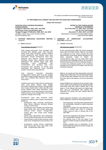 PT Pertamina Hulu Energi 503 2022The original consolidated financial statements included herein are in the Indonesian language.PT PERTAMINA HULU ENERGI TBK DAN ENTITAS ANAK/AND SUBSIDIARIES Daftar 5/64 ScheduleCATATAN ATAS LAPORAN KEUANGANKONSOLIDASIANTanggal 31 Desember 2022, 2021, dan 2020serta Untuk Tahun yang Berakhir pada Tanggal-Tanggal 31 Desember 2020, 2021, dan 2020(Disajikan dalam ribuan dolar Amerika Serikat, kecuali dinyatakan lain)NOTES TO THE CONSOLIDATEDFINANCIAL STATEMENTSAs of December 31, 2022, 2021, and 2020and For The Years Ended December 31, 2022, 2021, and 2020(Expressed in thousands of United States dollars,unless otherwise stated)3. IKHTISAR KEBIJAKAN AKUNTANSI PENTING(lanjutan)3. SUMMARY OF SIGNIFICANT ACCOUNTINGPOLICIES (continued)n. Sewa (lanjutan) n. Leases (continued)Grup sebagai penyewa (lanjutan) The Group as Lessee (continued)Pada tanggal permulaan, Grup mengakui asethak-guna dan liabilitas sewa. Aset hak-gunadiukur pada biaya perolehan, dimana meliputijumlah pengukuran awal liabilitas sewa yangdisesuaikan dengan pembayaran sewa yangdilakukan atau sebelum tanggal permulaan,ditambah dengan biaya langsung awal yangdikeluarkan dan estimasi biaya yang akandikeluarkan untuk membongkar danmemindahkan aset pendasar atau untukmerestorasi aset pendasar ke kondisi yangdisyaratkan dan ketentuan sewa, dikurangidengan insentif sewa yang diterima.At the commencement date, the Group recognizelease rights and lease assets. Right to use assetsare measured at cost, which includes the initialmeasurement of the lease liability adjusted for thelease payments made or before thecommencement date, plus the initial direct costsincurred and the estimated costs to be incurred todecommisioning and move the underlying assets or to restore the underlying assets to the conditionsrequired and the terms of the lease, less the rentincentives received.Aset hak-guna kemudian disusutkanmenggunakan metode garis lurus dari tanggalpermulaan hingga tanggal yang lebih awal antaraakhir umur manfaat aset hak-guna atau akhirmasa sewa.Right to use assets are then depreciated using the straight-line method from the commencement date to the earliest date between the end of the useful life of the right to use assets or the end of the lease period.Liabilitas sewa diukur pada nilai kini pembayaransewa yang belum dibayar pada tanggalpermulaan, didiskontokan dengan menggunakansuku bunga implisit dalam sewa atau jika sukubunga tersebut tidak dapat ditentukan, makamenggunakan suku bunga pinjaman inkremental.Pada umumnya, Grup menggunakan suku bunga pinjaman sebagai suku bunga.Lease liabilities are measured at the present value of the unpaid rent payments at the beginning date, discounted using the implicit interest rate in the lease or if the interest rate cannot be determined, then using an incremental loan interest rate. Generally, the Group use loan interest rates as interest rates.Pembayaran sewa yang termasuk dalampengukuran liabilitas sewa meliputi pembayaranberikut ini:Lease payments included in the measurement of lease obligations include the following payments:- pembayaran tetap, termasuk pembayarantetap secara substansi dikurangi denganpiutang insentif sewa;- fixed payments, including fixed payments thatare substantially reduced by lease incentivesreceivables;- pembayaran sewa variable yang bergantungpada indeks atau suku bunga yang padaawalnya diukur dengan menggunakanindeksi atau suku bunga pada tanggalpermulaan;- payment of variable rent that depends on theindex or interest rate which is measuredinitially using an index or interest rate at thestart date;- jumlah yang diperkirakan akan dibayarkanoleh penyewa dengan jaminan nilai residual;- the amount expected to be paid by the lesseewith a guaranteed residual value;- harga eksekusi opsi beli jika penyewa cukuppasti untuk mengeksekusi opsi tersebut; dan- the exercise price of the buy option if thelessee is certain enough to execute the option; and- pembayaran penalti karena penghentiansewa kecuali jika Grup cukup pasti untuktidak menghentikan lebih awal.- penalty payment due to termination of thelease unless the Group are certain enough not to terminate earlier.