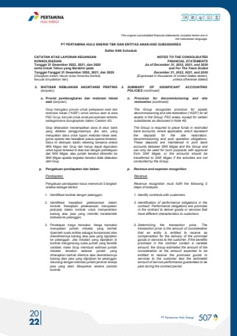 PT Pertamina Hulu Energi 507 2022The original consolidated financial statements included herein are in the Indonesian language.PT PERTAMINA HULU ENERGI TBK DAN ENTITAS ANAK/AND SUBSIDIARIES Daftar 5/68 ScheduleCATATAN ATAS LAPORAN KEUANGANKONSOLIDASIANTanggal 31 Desember 2022, 2021, dan 2020serta Untuk Tahun yang Berakhir pada Tanggal-Tanggal 31 Desember 2020, 2021, dan 2020(Disajikan dalam ribuan dolar Amerika Serikat, kecuali dinyatakan lain)NOTES TO THE CONSOLIDATEDFINANCIAL STATEMENTSAs of December 31, 2022, 2021, and 2020and For The Years Ended December 31, 2022, 2021, and 2020(Expressed in thousands of United States dollars,unless otherwise stated)3. IKHTISAR KEBIJAKAN AKUNTANSI PENTING (lanjutan)3. SUMMARY OF SIGNIFICANT ACCOUNTING POLICIES (continued)o. Provisi pembongkaran dan restorasi lokasi aset (lanjutan)o. Provision for decommissioning and site restoration (continued)Grup mengakui provisi untuk pelepasan aset dan restorasi lokasi (%u201cASR%u201d) untuk semua aset di area PSC Grup, kecuali untuk anak perusahaan tertentu sebagaimana diungkapkan dalam Catatan 45i.The Group recognizes provision for assets decommissioning and site restoration (%u201cASR%u201d) for all assets in the Group%u2019 PSC areas, except for certain subsidiaries as disclosed in Note 45i.Grup diharuskan menempatkan dana di akun bank yang dibatasi penggunaannya, jika ada, yang merupakan dana untuk tujuan restorasi lokasi aset, purna operasi dan kewajiban pasca operasi tersebut. Dana ini disimpan dalam rekening bersama antara SKK Migas dan Grup dan hanya dapat digunakan untuk tujuan tersebut di atas dan dengan persetujuan dari SKK Migas, atau jumlah tersebut ditransfer ke SKK Migas apabila kegiatan tersebut tidak dilakukan oleh Grup. The Group is required to place funds in restricted bank accounts, where applicable, which represent the deposits for the site restoration, decommissioning and post operation obligations. These deposits are maintained in joint bank accounts between SKK Migas and the Group and can only be used for such purposes with approval from SKK Migas, or the amounts should be transferred to SKK Migas if the activities are not conducted by the Group.p. Pengakuan pendapatan dan beban p. Revenue and expense recognitionPendapatan RevenuePengakuan pendapatan harus memenuhi 5 langkah analisa sebagai berikut:Revenue recognition must fulfill the following 5 steps of analysis:1. Identifikasi kontrak dengan pelanggan. 1. Identify contracts with customers.2. Identifikasi kewajiban pelaksanaan dalam kontrak. Kewajiban pelaksanaan merupakan janji-janji dalam kontrak untuk menyerahkan barang atau jasa yang memiliki karakteristik berbeda ke pelanggan.2. Identification of performance obligations in the contract. Performance obligations are promises in the contract to deliver goods or services that have different characteristics to customers. 3. Penetapan harga transaksi. Harga transaksi merupakan jumlah imbalan yang berhak diperoleh suatu entitas sebagai kompensasi atas diserahkannya barang atau jasa yang dijanjikan ke pelanggan. Jika imbalan yang dijanjikan di kontrak mengandung suatu jumlah yang bersifat variabel, maka Grup membuat estimasi jumlah imbalan tersebut sebesar jumlah yang diharapkan berhak diterima atas diserahkannya barang atau jasa yang dijanjikan ke pelanggan dikurangi dengan estimasi jumlah jaminan kinerja jasa yang akan dibayarkan selama periode kontrak.3. Determining the transaction price. The transaction price is the amount of consideration that an entity is entitled to receive as compensation for the delivery of the promised goods or services to the customer. If the benefits promised in the contract contain a variable amount, the Group estimates the amount of the consideration at the amount expected to be entitled to receive the promised goods or services to the customer less the estimated amount of service performance guarantees to be paid during the contract period.