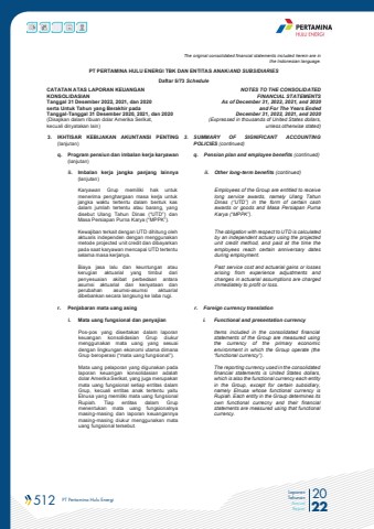 512 PT Pertamina Hulu Energi 2022Laporan TahunanAnnual ReportThe original consolidated financial statements included herein are in the Indonesian language.PT PERTAMINA HULU ENERGI TBK DAN ENTITAS ANAK/AND SUBSIDIARIES Daftar 5/73 ScheduleCATATAN ATAS LAPORAN KEUANGANKONSOLIDASIANTanggal 31 Desember 2022, 2021, dan 2020serta Untuk Tahun yang Berakhir pada Tanggal-Tanggal 31 Desember 2020, 2021, dan 2020(Disajikan dalam ribuan dolar Amerika Serikat, kecuali dinyatakan lain)NOTES TO THE CONSOLIDATEDFINANCIAL STATEMENTSAs of December 31, 2022, 2021, and 2020and For The Years Ended December 31, 2022, 2021, and 2020(Expressed in thousands of United States dollars,unless otherwise stated)3. IKHTISAR KEBIJAKAN AKUNTANSI PENTING (lanjutan)3. SUMMARY OF SIGNIFICANT ACCOUNTING POLICIES (continued)q. Program pensiun dan imbalan kerja karyawan (lanjutan)q. Pension plan and employee benefits (continued)ii. Imbalan kerja jangka panjang lainnya (lanjutan)ii. Other long-term benefits (continued)Karyawan Grup memiliki hak untuk menerima penghargaan masa kerja untuk jangka waktu tertentu dalam bentuk kas dalam jumlah tertentu atau barang, yang disebut Ulang Tahun Dinas (%u201cUTD%u201d) dan Masa Persiapan Purna Karya (%u201cMPPK%u201d).Employees of the Group are entitled to receive long service awards, namely Ulang Tahun Dinas (%u201cUTD%u201d) in the form of certain cash awards or goods and Masa Persiapan Purna Karya (%u201cMPPK%u201d).Kewajiban terkait dengan UTD dihitung oleh aktuaris independen dengan menggunakan metode projected unit credit dan dibayarkan pada saat karyawan mencapai UTD tertentu selama masa kerjanya.The obligation with respect to UTD is calculated by an independent actuary using the projected unit credit method, and paid at the time the employees reach certain anniversary dates during employment.Biaya jasa lalu dan keuntungan atau kerugian aktuarial yang timbul dari penyesuaian akibat perbedaan antara asumsi aktuarial dan kenyataan dan perubahan asumsi-asumsi aktuarial dibebankan secara langsung ke laba rugi.Past service cost and actuarial gains or losses arising from experience adjustments and changes in actuarial assumptions are charged immediately to profit or loss.r. Penjabaran mata uang asing r. Foreign currency translationi. Mata uang fungsional dan penyajian i. Functional and presentation currencyPos-pos yang disertakan dalam laporan keuangan konsolidasian Grup diukur menggunakan mata uang yang sesuai dengan lingkungan ekonomi utama dimana Grup beroperasi (%u201cmata uang fungsional%u201d).Items included in the consolidated financial statements of the Group are measured using the currency of the primary economic environment in which the Group operate (the %u201cfunctional currency%u201d).Mata uang pelaporan yang digunakan pada laporan keuangan konsolidasian adalah dolar Amerika Serikat, yang juga merupakan mata uang fungsional setiap entitas dalam Grup, kecuali entitas anak tertentu yaitu Elnusa yang memiliki mata uang fungsional Rupiah. Tiap entitas dalam Grup menentukan mata uang fungsionalnya masing-masing dan laporan keuangannya masing-masing diukur menggunakan mata uang fungsional tersebut.The reporting currency used in the consolidated financial statements is United States dollars, which is also the functional currency each entityin the Group, except for certain subsidiary, namely Elnusa whose functional currency is Rupiah. Each entity in the Group determines its own functional currecny and their financial statements are measured using that functional currency.
