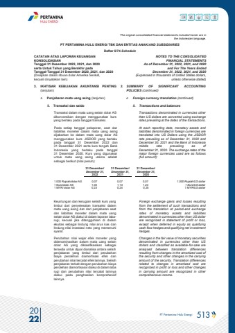 PT Pertamina Hulu Energi 513 2022The original consolidated financial statements included herein are in the Indonesian language.PT PERTAMINA HULU ENERGI TBK DAN ENTITAS ANAK/AND SUBSIDIARIES Daftar 5/74 ScheduleCATATAN ATAS LAPORAN KEUANGANKONSOLIDASIANTanggal 31 Desember 2022, 2021, dan 2020serta Untuk Tahun yang Berakhir pada Tanggal-Tanggal 31 Desember 2020, 2021, dan 2020(Disajikan dalam ribuan dolar Amerika Serikat, kecuali dinyatakan lain)NOTES TO THE CONSOLIDATEDFINANCIAL STATEMENTSAs of December 31, 2022, 2021, and 2020and For The Years Ended December 31, 2022, 2021, and 2020(Expressed in thousands of United States dollars,unless otherwise stated)3. IKHTISAR KEBIJAKAN AKUNTANSI PENTING (lanjutan)3. SUMMARY OF SIGNIFICANT ACCOUNTING POLICIES (continued)r. Penjabaran mata uang asing (lanjutan) r. Foreign currency translation (continued)ii. Transaksi dan saldo ii. Transactions and balancesTransaksi dalam mata uang selain dolar AS dikonversikan dengan menggunakan kurs yang berlaku pada tanggal transaksi. Transactions denominated in currencies other than US dollars are converted using exchange rates prevailing at the dates of the transactions. Pada setiap tanggal pelaporan, aset dan liabilitas moneter dalam mata uang asing dijabarkan ke dalam mata uang dolar AS menggunakan kurs JISDOR yang berlaku pada tanggal 31 Desember 2022 dan 31 Desember 2021 serta kurs tengah Bank Indonesia yang berlaku pada tanggal 31 Desember 2020. Kurs yang digunakan untuk mata uang asing utama adalah sebagai berikut (nilai penuh):At each reporting date, monetary assets and liabilities denominated in foreign currencies are translated into US Dollars using the JISDOR rate prevailing as of December 31, 2022 and December 30, 2021 and the Bank of Indonesia middle rate prevailing as of December 31, 2020. The exchange rates of the major foreign currencies used are as follows (full amount): 31 Desember/ 31 Desember/ 31 Desember/ December 31, December 31, December 31, 2022 2021 2020 1.000 Rupiah/dolar AS 0,07 0,07 0,07 1.000 Rupiah/US dollar 1 Euro/dolar AS 1,05 1,13 1,23 1 Euro/US dollar 1 MYR/ dolar AS 0,23 0,24 0,25 1 MYR/US dollarKeuntungan dan kerugian selisih kurs yang timbul dari penyelesaian transaksi dalam mata uang asing dan dari penjabaran aset dan liabilitas moneter dalam mata uang selain dolar AS diakui di dalam laporan labarugi, kecuali jika ditangguhkan di dalam ekuitas sebagai lindung nilai arus kas dan lindung nilai investasi neto yang memenuhi syarat.Foreign exchange gains and losses resulting from the settlement of such transactions and from the translation at period-end exchange rates of monetary assets and liabilities denominated in currencies other than US dollar are recognized in statement of profit or loss, except when deferred in equity as qualifying cash flow hedges and qualifying net investment hedges.Perubahan nilai wajar efek moneter yang didenominasikan dalam mata uang selain dolar AS yang diklasifikasikan sebagai tersedia untuk dijual dianalisa antara selisih penjabaran yang timbul dari perubahan biaya perolehan diamortisasi efek dan perubahan nilai tercatat efek lainnya. Selisih penjabaran terkait dengan perubahan biaya perolehan diamortisasxi diakui di dalam laba rugi dan perubahan nilai tercatat lainnya diakui pada penghasilan komprehensif lainnya.Changes in the fair value of monetary securities denominated in currencies other than US dollars and classified as available-for-sale are analysed between translation differences resulting from changes in the amortized cost of the security and other changes in the carrying amount of the security. Translation differences related to changes in amortized cost are recognized in profit or loss and other changes in carrying amount are recognized in other comprehensive income.