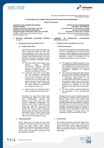514 PT Pertamina Hulu Energi 2022Laporan TahunanAnnual ReportThe original consolidated financial statements included herein are in the Indonesian language.PT PERTAMINA HULU ENERGI TBK DAN ENTITAS ANAK/AND SUBSIDIARIES Daftar 5/75 ScheduleCATATAN ATAS LAPORAN KEUANGANKONSOLIDASIANTanggal 31 Desember 2022, 2021, dan 2020serta Untuk Tahun yang Berakhir pada Tanggal-Tanggal 31 Desember 2020, 2021, dan 2020(Disajikan dalam ribuan dolar Amerika Serikat, kecuali dinyatakan lain)NOTES TO THE CONSOLIDATEDFINANCIAL STATEMENTSAs of December 31, 2022, 2021, and 2020and For The Years Ended December 31, 2022, 2021, and 2020(Expressed in thousands of United States dollars,unless otherwise stated)3. IKHTISAR KEBIJAKAN AKUNTANSI PENTING (lanjutan)3. SUMMARY OF SIGNIFICANT ACCOUNTING POLICIES (continued)r. Penjabaran mata uang asing (lanjutan) r. Foreign currency translation (continued)iii. Entitas dalam Grup iii. Group companiesHasil usaha operasi dan posisi keuangan dari seluruh entitas anak (tidak ada yang mata uang fungsionalnya mata uang dari suatu ekonomi hiperinflasi) yang memiliki mata uang fungsional yang berbeda dengan mata uang penyajian Perusahaan, ditranslasikan dalam mata uang penyajian Perusahaan sebagai berikut:The results of the operations and financial position of all the subsidiaries (none of which has the currency of a hyperinflationary economy) that have a functional currency different from the Company%u2019s presentation currency are translated into the Company%u2019s presentation currency as follows:(a) Aset dan liabilitas yang disajikan pada laporan posisi keuangan konsolidasian, dijabarkan pada kurs penutup yang ditetapkan oleh Bank Indonesia tanggal laporan posisi keuangan konsolidasian tersebut;(a) The assets and liabilities presented in the consolidated statement of financial position are translated at the closing rate which is set by Bank of Indonesia on the date of the consolidated statement of financial position;(b) Penghasilan dan beban untuk setiap laba rugi dijabarkan menggunakan kurs rata-rata (kecuali jika rata-rata tersebut bukan perkiraan wajar efek kumulatif dari kurs yang berlaku pada tanggal transaksi yang ditetapkan oleh Bank Indonesia, maka penghasilan dan beban dijabarkan menggunakan kurs tanggal transaksi); dan(b) The income and expenses for each profit or loss account are translated at the average exchange rates (unless this average is not a reasonable approximation of the cumulative effect of the rates prevailing on the transaction dates which is set by Bank of Indonesia, in which case the income and expenses are translated at the rates prevailing on the dates of the transactions); and(c) Seluruh selisih kurs yang timbul diakui dalam penghasilan komprehensif lain.(c) All of the resulting exchange differences are recognized in other comprehensive income.Perubahan nilai wajar efek moneter yang didenominasikan dalam mata uang asing yang diklasifikasikan sebagai aset keuangan yang dinilai pada nilai wajar melalui pendapatan komprehensif lain dianalisis antara selisih penjabaran yang timbul dari perubahan biaya perolehan diamortisasi efek dan perubahan nilai tercatat efek lainnya. Selisih penjabaran terkait dengan perubahan biaya perolehan diamortisasi diakui di dalam laporan laba rugi, dan perubahan nilai tercatat lainnya diakui pada laba komprehensif lainnya.Changes in the fair value of monetary securities denominated in foreign currency classified as financial assets at fair value through other comprehensive income is analysed between translation differences resulting from changes in the amortized cost of the security and other changes in the carrying amount of the security. Translation differences related to changes in amortized cost are recognized in profit or loss, and other changes in carrying amount are recognized in other comprehensive income.s. Pajak penghasilan s. Income taxesBeban pajak terdiri dari pajak kini dan pajak tangguhan. Pajak diakui dalam laporan laba rugi, kecuali jika pajak tersebut terkait dengan transaksi atau kejadian yang langsung diakui ke ekuitas. Pada kasus ini, pajak tersebut masingmasing diakui di pendapatan komprehensif lain atau langsung di ekuitas.Tax expense comprises current and deferred tax. Tax is recognized in profit or loss, except to the extent that it relates to items recognized directly in equity. In this case, the tax is also recognized in other comprehensive income or directly in equity, respectively.