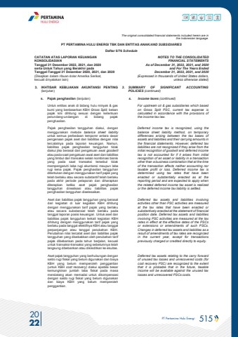 PT Pertamina Hulu Energi 515 2022The original consolidated financial statements included herein are in the Indonesian language.PT PERTAMINA HULU ENERGI TBK DAN ENTITAS ANAK/AND SUBSIDIARIES Daftar 5/76 ScheduleCATATAN ATAS LAPORAN KEUANGANKONSOLIDASIANTanggal 31 Desember 2022, 2021, dan 2020serta Untuk Tahun yang Berakhir pada Tanggal-Tanggal 31 Desember 2020, 2021, dan 2020(Disajikan dalam ribuan dolar Amerika Serikat, kecuali dinyatakan lain)NOTES TO THE CONSOLIDATEDFINANCIAL STATEMENTSAs of December 31, 2022, 2021, and 2020and For The Years Ended December 31, 2022, 2021, and 2020(Expressed in thousands of United States dollars,unless otherwise stated)3. IKHTISAR KEBIJAKAN AKUNTANSI PENTING (lanjutan)3. SUMMARY OF SIGNIFICANT ACCOUNTING POLICIES (continued)s. Pajak penghasilan (lanjutan) s. Income taxes (continued)Untuk entitas anak di bidang hulu minyak & gas bumi yang berdasarkan KBH Gross Split, beban pajak kini dihitung sesuai dengan ketentuan perundang-undangan di bidang pajak penghasilan.For upstream oil & gas subsidiaries which based on Gross Split PSC, current tax expense is calculated in accordance with the provisions of the income tax law.Pajak penghasilan tangguhan diakui, dengan menggunakan metode balance sheet liabilityuntuk semua perbedaan temporer antara dasar pengenaan pajak aset dan liabilitas dengan nilai tercatatnya pada laporan keuangan. Namun, liabilitas pajak penghasilan tangguhan tidak diakui jika berasal dari pengakuan awal goodwillatau pada saat pengakuan awal aset dan liabilitas yang timbul dari transaksi selain kombinasi bisnis yang pada saat transaksi tersebut tidak mempengaruhi laba rugi akuntansi maupun laba rugi kena pajak. Pajak penghasilan tangguhan ditentukan dengan menggunakan tarif pajak yang telah berlaku atau secara substantif telah berlaku pada akhir periode pelaporan dan diharapkan diterapkan ketika aset pajak penghasilan tangguhan direalisasi atau liabilitas pajak penghasilan tangguhan diselesaikan.Deferred income tax is recognized, using thebalance sheet liability method, on temporary differences arising between the tax bases of assets and liabilities and their carrying amounts in the financial statements. However, deferred tax liabilities are not recognized if they arise from the initial recognition of goodwill and deferred income tax is not accounted for if it arises from initial recognition of an asset or liability in a transaction other than a business combination that at the time of the transaction affects neither accounting nor taxable profit or loss. Deferred income tax is determined using tax rates that have been enacted or substantially enacted as at the reporting period and are expected to apply when the related deferred income tax asset is realized or the deferred income tax liability is settled.Aset dan liabilitas pajak tangguhan yang berasal dari kegiatan di luar kegiatan KBH dihitung dengan menggunakan tarif pajak yang berlaku atau secara substansial telah berlaku pada tanggal laporan posisi keuangan. Untuk aset dan liabilitas pajak tangguhan terkait kegiatan KBH dihitung dengan menggunakan tarif pajak yang berlaku pada tanggal efektifnya KBH atau tanggal perpanjangan atau tanggal perubahan KBH. Perubahan nilai tercatat aset dan liabilitas pajak tangguhan yang disebabkan oleh perubahan tarif pajak dibebankan pada tahun berjalan, kecuali untuk transaksi-transaksi yang sebelumnya telah langsung dibebankan atau dikreditkan ke ekuitas.Deferred tax assets and liabilities involving activities other than PSC activities are measured at the tax rates that have been enacted or substantively enacted at the statement of financial position date. Deferred tax assets and liabilities involving PSC activities are measured at the tax rates in effect at the effective dates of the PSCs or extensions or amendments of such PSCs. Changes in deferred tax assets and liabilities as a result of amendments of tax rates are recognized in the current year, except for transactions previously charged or credited directly to equity.Aset pajak tangguhan yang berhubungan dengan saldo rugi fiskal yang belum digunakan dan biaya KBH yang belum memperoleh penggantian (untuk KBH cost recovery) diakui apabila besar kemungkinan jumlah laba fiskal pada masa mendatang akan memadai untuk dikompensasi dengan saldo rugi fiskal yang belum digunakan dan biaya KBH yang belum memperoleh penggantian.Deferred tax assets relating to the carry forward of unused tax losses and unrecovered costs (for cost recovery PSC) are recognized to the extent that it is probable that in the future, taxable income will be available against the unused tax losses and unrecovered PSCs costs.