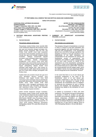 PT Pertamina Hulu Energi 517 2022The original consolidated financial statements included herein are in the Indonesian language.PT PERTAMINA HULU ENERGI TBK DAN ENTITAS ANAK/AND SUBSIDIARIES Daftar 5/78 ScheduleCATATAN ATAS LAPORAN KEUANGANKONSOLIDASIANTanggal 31 Desember 2022, 2021, dan 2020serta Untuk Tahun yang Berakhir pada Tanggal-Tanggal 31 Desember 2020, 2021, dan 2020(Disajikan dalam ribuan dolar Amerika Serikat, kecuali dinyatakan lain)NOTES TO THE CONSOLIDATEDFINANCIAL STATEMENTSAs of December 31, 2022, 2021, and 2020and For The Years Ended December 31, 2022, 2021, and 2020(Expressed in thousands of United States dollars,unless otherwise stated)3. IKHTISAR KEBIJAKAN AKUNTANSI PENTING (lanjutan)3. SUMMARY OF SIGNIFICANT ACCOUNTING POLICIES (continued)v. Carried interests v. Carried interestsPerusahaan sebagai carried partyPerusahaan melalui Entitas Anak memiliki KBH untuk melakukan eksplorasi dan produksi minyak dan gas bumi bersama dengan kontraktor lain. Dalam kontrak kerjasama JOB dan PPI, jika Entitas Anak memilih untuk tidak melakukan pendanaan maka kewajiban pembiayaan operasi minyak dan gas bumi menjadi tanggung jawab kontraktor. Sebagai kompensasi kepada kontraktor yang membiayai beban bagian Entitas Anak, kontraktor berhak mendapatkan penggantian untuk seluruh biaya yang telah dikeluarkan atas nama Entitas Anak yang diambil dari hasil produksi minyak mentah dan gas bumi bagian participating interest Entitas Anakditambah uplift sebesar 50%. Oleh karena itu, kompensasi dan uplift, dalam bentuk minyak dan gas bumi tidak diakui sebagai pendapatan oleh Entitas Anak.The Company as a carried partyThe Company through its Subsidiaries is involved in PSCs to conduct oil and gas exploration and production together with other contractors. Under JOB and PPI arrangements, if the Subsidiariesdecide not to fund the oil and gas operations, the obligation to finance oil and gas operations is the responsibility of the other contractors. As compensation for the contractors for carrying the Subsidiaries%u2019 portion of expenditures, the contractors are entitled to obtain reimbursement for all sunk costs incurred on behalf of the Subsidiaries out of the Subsidiaries%u2019 participating interests in crude oil and natural gas produced in the contract areas plus an uplift of 50%. Therefore, the reimbursements and the related uplifts, which are settled in terms of oil and natural gas liftings, are not recognized as the Subsidiaries%u2019 revenue.Apabila tidak ada produksi minyak dan gas bumi yang dihasilkan ataupun produksi yang dihasilkan oleh bagian Entitas Anak tidak mencukupi untuk membayar seluruh pembiayaanyang telah dikeluarkan oleh kontraktor atas nama Entitas Anak, maka Entitas Anak tidak diharuskan untuk mengganti pembiayaan yang telah dikeluarkan oleh kontraktor tersebut dan oleh karenanya Entitas Anak tidak mengakui adanya liabilitas kepada kontraktor.In the event that there is no oil and natural gas production entitlement or the value of the Subsidiaries%u2019 share of oil and natural gas production entitlements is less than the funding incurred by the contractors on behalf of the Subsidiaries, the Subsidiaries have no obligation to reimburse the contractors for such a funding amount and therefore, the Subsidiaries do not recognize any liability to the contractors for such amounts.Selain kontrak kerjasama dengan kontraktor, Perusahaan melalui Entitas Anak memiliki KBH untuk melakukan eksplorasi dan produksi minyak dan gas bumi bersama dengan Badan Usaha Milik Daerah (%u201cBUMD%u201d) atau Perusahaan Daerah berdasarkan Peraturan Menteri Energi dan Sumber Daya Mineral Republik Indonesia No. 37Tahun 2016 tentang Ketentuan Penawaran Participating Interest 10% pada Blok Minyak dan Gas Bumi.In addition to involvement in PSCs with other contractors, The Company through its Subsidiaries is involved in PSCs to conduct oil and gas exploration and production together with Regional Owned Enterprises (\Companies based on Regulation of the Minister of Energy and Mineral Resources of the Republic of Indonesia No. 37 year 2016 on Offering Terms of10% Participating Interest in Oil and Gas Block.