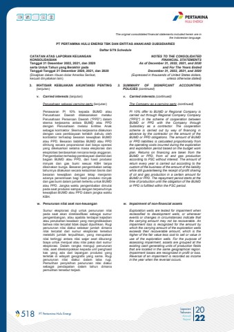 518 PT Pertamina Hulu Energi 2022Laporan TahunanAnnual ReportThe original consolidated financial statements included herein are in the Indonesian language.PT PERTAMINA HULU ENERGI TBK DAN ENTITAS ANAK/AND SUBSIDIARIES Daftar 5/79 ScheduleCATATAN ATAS LAPORAN KEUANGANKONSOLIDASIANTanggal 31 Desember 2022, 2021, dan 2020serta Untuk Tahun yang Berakhir pada Tanggal-Tanggal 31 Desember 2020, 2021, dan 2020(Disajikan dalam ribuan dolar Amerika Serikat, kecuali dinyatakan lain)NOTES TO THE CONSOLIDATEDFINANCIAL STATEMENTSAs of December 31, 2022, 2021, and 2020and For The Years Ended December 31, 2022, 2021, and 2020(Expressed in thousands of United States dollars,unless otherwise stated)3. IKHTISAR KEBIJAKAN AKUNTANSI PENTING (lanjutan)3. SUMMARY OF SIGNIFICANT ACCOUNTING POLICIES (continued)v. Carried interests (lanjutan) v. Carried interests (continued)Perusahaan sebagai carrying party (lanjutan)Penawaran PI 10% kepada BUMD atau Perusahaan Daerah dilaksanakan melalui Perusahaan Perseroan Daerah (%u201cPPD%u201d) dalam skema kerjasama antara BUMD atau PPD dengan Perusahaan melalui Entitas Anak sebagai kontraktor. Skema kerjasama dilakukan dengan cara pembiayaan terlebih dahulu oleh kontraktor terhadap besaran kewajiban BUMD atau PPD. Besaran liabilitas BUMD atau PPD dihitung secara proporsional dari biaya operasi yang dikeluarkan selama masa eksplorasi dan eksploitasi berdasarkan rencana kerja anggaran. Pengembalian terhadap pembiayaan diambil dari bagian BUMD atau PPD, dari hasil produksi minyak dan gas bumi sesuai KBH tanpa dikenakan bunga. Besaran pengembalian setiap tahunnya dilakukan secara kelaziman bisnis dari besaran kewajiban dengan tetap menjamin adanya penerimaan bagi hasil produksi minyak dan gas bumi dalam jumlah tertentu untuk BUMD atau PPD. Jangka waktu pengembalian dimulai pada saat produksi sampai dengan terpenuhinya kewajiban BUMD atau PPD dalam jangka waktu KBH.The Company as a carrying party (continued)PI 10% offer to BUMD or Regional Company is carried out through Regional Company Company (\BUMD or PPD with the Company through Subsidiary as a contractor. The cooperation scheme is carried out by way of financing in advance by the contractor on the amount of the BUMD or PPD obligations. The amount of BUMD or PPD liabilities is calculated proportionally from the operating costs incurred during the exploration and exploitation period based on the budget work plan. Returns on financing are taken from the BUMD or PPD, from oil and gas production according to PSC without interest. The amount of return every year is carried out according to the custom of the business of the amount of the liability while still guaranteeing the receipt of profit sharing of oil and gas production in a certain amount forBUMD or PPD. The repayment period starts at the time of production until the obligation of the BUMD or PPD is fulfilled within the PSC period.w. Penurunan nilai aset non-keuangan w. Impairment of non-financial assetsSumur eksplorasi diuji untuk penurunan nilai pada saat akan direklasifikasi sebagai sumur pengembangan, atau apabila terdapat kejadian atau perubahan keadaan yang mengindikasikan bahwa nilai tercatat tidak dapat dipulihkan. Rugi penurunan nilai diakui sebesar jumlah dimana nilai tercatat dari sumur eksplorasi tersebut melebihi jumlah terpulihkan, yang merupakan nilai tertinggi antara nilai wajar aset dikurangi biaya untuk menjual atau nilai pakai dari sumur eksplorasi. Dalam rangka menguji penurunan nilai, aset dikelompokkan kepada unit penghasil kas yang ada dari lapangan produksi yang terletak di wilayah geografis yang sama. Rugi penurunan nilai diakui dalam laba rugi. Pemulihan penyisihan penurunan nilai diakui sebagai pendapatan dalam tahun dimana pemulihan tersebut terjadi.Exploration wells are tested for impairment when reclassified to development wells, or whenever events or changes in circumstances indicate that the carrying amount may not be recoverable. An impairment loss is recognized for the amount by which the carrying amount of the exploration wells exceeds their recoverable amount, which is the higher of the fair value less cost to sell or value in use of the exploration wells. For the purpose of assessing impairment, assets are grouped at the existing cash generating units of production fields that are located in the same geographical region. Impairment losses are recognized in profit or loss. Reversal of an impairment is recorded as income in the year when the reversal occurs.