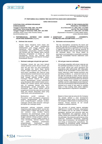 524 PT Pertamina Hulu Energi 2022Laporan TahunanAnnual ReportThe original consolidated financial statements included herein are in the Indonesian language.PT PERTAMINA HULU ENERGI TBK DAN ENTITAS ANAK/AND SUBSIDIARIES Daftar 5/85 ScheduleCATATAN ATAS LAPORAN KEUANGANKONSOLIDASIANTanggal 31 Desember 2022, 2021, dan 2020serta Untuk Tahun yang Berakhir padaTanggal-Tanggal 31 Desember 2020, 2021, dan 2020(Disajikan dalam ribuan dolar Amerika Serikat, kecuali dinyatakan lain)NOTES TO THE CONSOLIDATEDFINANCIAL STATEMENTSAs of December 31, 2022, 2021, and 2020and For The Years Ended December 31, 2022, 2021, and 2020 (Expressed in thousands of United States dollars,unless otherwise stated)4. PERTIMBANGAN, ESTIMASI DAN ASUMSIAKUNTANSI SIGNIFIKAN (lanjutan)4. SIGNIFICANT ACCOUNTING JUDGMENTS, ESTIMATES AND ASSUMPTIONS (continued)b. Estimasi dan asumsi b. Estimates and assumptions Asumsi utama mengenai masa depan dan sumber utama lain dalam mengestimasi ketidakpastian pada tanggal pelaporan yang mempunyai risiko signifikan yang dapat menyebabkan penyesuaian material terhadap nilai tercatat aset dan liabilitas dalam periode berikutnya diungkapkan di bawah ini. Grup mendasarkan asumsi dan estimasi pada parameter yang tersedia saat laporan keuangan konsolidasian disusun.The key assumptions concerning the future and other key sources of estimation uncertainty at the reporting date that have a significant risk of causing a material adjustment to the carrying amounts of assets and liabilities within the next financial periodare disclosed below. The Group based its assumptions and estimates on parameters available when the consolidated financial statements were prepared. i. Estimasi cadangan minyak dan gas bumi i. Oil and gas reserves estimatesCadangan minyak dan gas bumi terbukti adalah perkiraan jumlah minyak mentah, gas alam dan gas alam cair yang berdasarkan data geologis dan teknis dapat diambil dengan tingkat kepastian yang memadai di tahun-tahun mendatang dari reservoir yang ada berdasarkan kondisi ekonomi dan operasi yang sekarang ada, yaitu harga dan biaya pada tanggal estimasi tersebut dibuat. Cadangan terbukti meliputi: (i) cadangan terbukti dikembangkan: jumlah hidrokarbon yang diharapkan akan diambil melalui sumur, fasilitas dan metode operasi yang sekarang ada; (ii) cadangan terbukti yang belum dikembangkan: jumlah hidrokarbon yang diharapkan dapat diambil setelah adanya pengeboran di area baru atau dari sumur yang telah ada dimana dibutuhkan biaya yang relatif besar untuk penyelesaiannya.Oil and gas properties with proven reserves are the estimated quantities of crude oil, natural gas and liquids natural gas which geological and engineering data demonstrate with reasonable certainty to be recoverable in future years from known reservoirs under existing economic and operating conditions, i.e., prices and costs as at the date the estimate is made. Proved reserves include: (i) proved developed reserves: amounts of hydrocarbons that are expected to be retrieved through existing wells, facilities and operating methods; and (ii) undeveloped proved reserves: amounts of hydrocarbons that are expected to be retrieved as a result of new wells on undrilled areas or from existing wells where relatively major expenditures is required for completion.Berdasarkan jumlah cadangan ini, Perusahaan telah menetapkan pengeluaran program pengembangan yang bertujuan untuk mengembangkan cadangan tersebut. Cadangan terbukti tidak termasuk cadangan terindikasi dan cadangan tereka.Based on these reserves amounts the Company has already defined a clear development expenditure program which is an expression of the Company's determination to develop existing reserves. Proved reserves do not include probable or possible reserves.Keakuratan estimasi cadangan terbukti tergantung pada sejumlah faktor, asumsi dan variabel seperti: kualitas data geologi, teknis dan ekonomi yang tersedia beserta interpretasi dan pertimbangan terkait, hasil pengeboran, pengujian dan produksi setelah tanggal estimasi, kinerja produksi reservoir, teknik produksi, proyeksi tingkat produksi di masa mendatang, estimasi besaran biaya dan waktu terjadinya pengeluaran pengembangan, ketersediaan pasar komersial, harga komoditi yang diharapkan dan nilai tukar.The accuracy of proved reserve estimates depends on a number of factors, assumptions and variables such as: the quality of available geological, technical and economic data and their interpretation and judgement, results of drilling, testing and production after the date of the estimates, the production performance of the reservoirs, production techniques, projecting future rates of production, the anticipated cost and timing of development expenditures, the availability for commercial market, anticipated commodity prices and exchange rates.