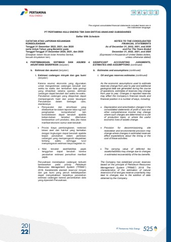 PT Pertamina Hulu Energi 525 2022The original consolidated financial statements included herein are in the Indonesian language.PT PERTAMINA HULU ENERGI TBK DAN ENTITAS ANAK/AND SUBSIDIARIES Daftar 5/86 ScheduleCATATAN ATAS LAPORAN KEUANGANKONSOLIDASIANTanggal 31 Desember 2022, 2021, dan 2020serta Untuk Tahun yang Berakhir padaTanggal-Tanggal 31 Desember 2020, 2021, dan 2020(Disajikan dalam ribuan dolar Amerika Serikat, kecuali dinyatakan lain)NOTES TO THE CONSOLIDATEDFINANCIAL STATEMENTSAs of December 31, 2022, 2021, and 2020and For The Years Ended December 31, 2022, 2021, and 2020 (Expressed in thousands of United States dollars,unless otherwise stated)4. PERTIMBANGAN, ESTIMASI DAN ASUMSI AKUNTANSI SIGNIFIKAN (lanjutan)4. SIGNIFICANT ACCOUNTING JUDGMENTS, ESTIMATES AND ASSUMPTIONS (continued)b. Estimasi dan asumsi (lanjutan) b. Estimates and assumptions (continued)i. Estimasi cadangan minyak dan gas bumi(lanjutan)i. Oil and gas reserves estimates (continued)Karena asumsi ekonomis yang digunakan untuk mengestimasi cadangan berubah dari waktu ke waktu dan tambahan data geologi yang dihasilkan selama operasi, estimasi cadangan dapat berubah dari waktu ke waktu. Perubahan cadangan yang dilaporkan dapat mempengaruhi hasil dan posisi keuangan Perusahaan dalam berbagai cara, diantaranya:As the economic assumptions used to estimate reserves change from year to year and additional geological data are generated during the course of operations, estimates of reserves may change from year to year. Changes in reported reserves may affect the Company%u2019s financial results and financial position in a number of ways, including:%u2022 Penyusutan dan amortisasi yang dibebankan ke dalam laporan laba rugi dan penghasilan komprehensif lain konsolidasian dapat berubah apabila beban-beban tersebut ditentukan berdasarkan unit produksi, atau jika masa manfaat ekonomi sumur aset berubah.%u2022 Depreciation and amortization charged in the consolidated statements of profit or loss and other comprehensive income may change where such charges are determined on a unit of production basis, or where the useful economic lives of assets change.%u2022 Provisi biaya pembongkaran, restorasi lokasi aset dan hal-hal yang berkaitan dengan lingkungan dapat berubah apabila terjadi perubahan dalam perkiraan cadangan yang mempengaruhi ekspektasi tentang waktu sehingga turut mempengaruhi estimasi biaya kegiatan ini.%u2022 Provision for decommissioning, site restoration and environmental provision may change where changes in estimated reserves affect expectations about the timing or the cost of these activities.%u2022 Nilai tercatat aset/liabilitas pajak tangguhan dapat berubah karena perubahan estimasi pemulihan manfaat pajak.%u2022 The carrying value of deferred tax assets/liabilities may change due to changes in estimated recoverability of the tax benefits.Perusahaan menetapkan cadangan terbukti berdasarkan pada prinsip Petroleum Resources Management System (%u201cPRMS%u201d) 2018. Karakteristik alamiah reservoir minyak dan gas bumi yang penuh ketidakpastian dapat menyebabkan terjadinya perubahan estimasi cadangan karena penambahan data yang diperoleh Perusahaan.The Company has establised proven reserves based on the principle of Petroleum Resources Management System (\characteristics of the estimation of natural reservoirs of oil and gas reserve uncertainty may lead to changes due to the addition of data obtained by the Company.
