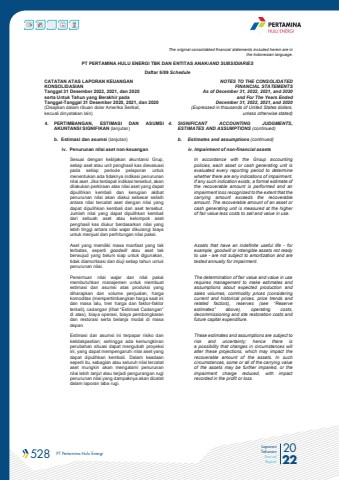 528 PT Pertamina Hulu Energi 2022Laporan TahunanAnnual ReportThe original consolidated financial statements included herein are in the Indonesian language.PT PERTAMINA HULU ENERGI TBK DAN ENTITAS ANAK/AND SUBSIDIARIES Daftar 5/89 ScheduleCATATAN ATAS LAPORAN KEUANGANKONSOLIDASIANTanggal 31 Desember 2022, 2021, dan 2020serta Untuk Tahun yang Berakhir padaTanggal-Tanggal 31 Desember 2020, 2021, dan 2020(Disajikan dalam ribuan dolar Amerika Serikat, kecuali dinyatakan lain)NOTES TO THE CONSOLIDATEDFINANCIAL STATEMENTSAs of December 31, 2022, 2021, and 2020and For The Years Ended December 31, 2022, 2021, and 2020 (Expressed in thousands of United States dollars,unless otherwise stated)4. PERTIMBANGAN, ESTIMASI DAN ASUMSI AKUNTANSI SIGNIFIKAN (lanjutan)4. SIGNIFICANT ACCOUNTING JUDGMENTS, ESTIMATES AND ASSUMPTIONS (continued)b. Estimasi dan asumsi (lanjutan) b. Estimates and assumptions (continued)iv. Penurunan nilai aset non-keuangan iv. Impairment of non-financial assetsSesuai dengan kebijakan akuntansi Grup, setiap aset atau unit penghasil kas dievaluasi pada setiap periode pelaporan untuk menentukan ada tidaknya indikasi penurunan nilai aset. Jika terdapat indikasi tersebut, akan dilakukan perkiraan atas nilai aset yang dapat dipulihkan kembali dan kerugian akibatpenurunan nilai akan diakui sebesar selisihantara nilai tercatat aset dengan nilai yang dapat dipulihkan kembali dari aset tersebut. Jumlah nilai yang dapat dipulihkan kembali dari sebuah aset atau kelompok aset penghasil kas diukur berdasarkan nilai yang lebih tinggi antara nilai wajar dikurangi biaya untuk menjual dan perhitungan nilai pakai.In accordance with the Group accounting policies, each asset or cash generating unit is evaluated every reporting period to determine whether there are any indications of impairment. If any such indication exists, a formal estimate of the recoverable amount is performed and an impairment loss recognized to the extent that the carrying amount exceeds the recoverable amount. The recoverable amount of an asset or cash generating unit is measured at the higher of fair value less costs to sell and value in use. Aset yang memiliki masa manfaat yang takterbatas, seperti goodwill atau aset tak berwujud yang belum siap untuk digunakan, tidak diamortisasi dan diuji setiap tahun untukpenurunan nilai. Assets that have an indefinite useful life - for example, goodwill or intangible assets not ready to use - are not subject to amortization and are tested annually for impairment.Penentuan nilai wajar dan nilai pakaimembutuhkan manajemen untuk membuatestimasi dan asumsi atas produksi yangdiharapkan dan volume penjualan, hargakomoditas (mempertimbangkan harga saat inidan masa lalu, tren harga dan faktor-faktorterkait), cadangan (lihat %u201cEstimasi Cadangan%u201d di atas), biaya operasi, biaya pembongkaran dan restorasi serta belanja modal di masa depan.The determination of fair value and value in use requires management to make estimates and assumptions about expected production and sales volumes, commodity prices (considering current and historical prices, price trends and related factors), reserves (see %u201cReserve estimates%u201d above), operating costs, decommissioning and site restoration costs and future capital expenditure. Estimasi dan asumsi ini terpapar risiko dan ketidakpastian; sehingga ada kemungkinan perubahan situasi dapat mengubah proyeksi ini, yang dapat mempengaruhi nilai aset yang dapat dipulihkan kembali. Dalam keadaan seperti itu, sebagian atau seluruh nilai tercatat aset mungkin akan mengalami penurunan nilai lebih lanjut atau terjadi pengurangan rugi penurunan nilai yang dampaknya akan dicatat dalam laporan laba rugi.These estimates and assumptions are subject to risk and uncertainty; hence there is a possibility that changes in circumstances will alter these projections, which may impact the recoverable amount of the assets. In such circumstances, some or all of the carrying value of the assets may be further impaired, or the impairment charge reduced, with impact recorded in the profit or loss.