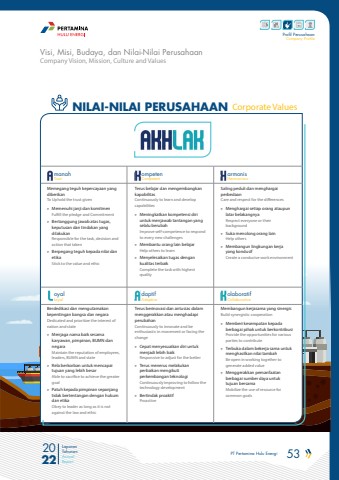 PT Pertamina Hulu Energi 53 2022Laporan TahunanAnnual ReportProfil PerusahaanCompany ProfileNILAI-NILAI PERUSAHAAN Corporate ValuesmanahTrustoyalLoyalompetenCompetentdaptifAdaptivearmonisHarmoniousolaboratifCollaborativeMemegang teguh kepercayaan yang diberikanTo Uphold the trust given%u00bb Memenuhi janji dan komitmen Fulfill the pledge and Commitment%u00bb Bertanggung jawab atas tugas, keputusan dan tindakan yang dilakukanResponsible for the task, decision and action that taken%u00bb Berpegang teguh kepada nilai dan etikaStick to the value and ethicBerdedikasi dan mengutamakan kepentingan bangsa dan negaraDedicated and prioritize the interest of nation and state%u00bb Menjaga nama baik sesama karyawan, pimpinan, BUMN dan negaraMaintain the reputation of employees, leaders, BUMN and state%u00bb Rela berkorban untuk mencapai tujuan yang lebih besarAble to sacrifice to achieve the greater goal%u00bb Patuh kepada pimpinan sepanjang tidak bertentangan dengan hukum dan etikaObey to leader as long as it is not against the law and ethicTerus belajar dan mengembangkan kapabilitasContinuously to learn and develop capabilities%u00bb Meningkatkan kompetensi diri untuk menjawab tantangan yang selalu berubahImprove self-competence to respond to every new challenges%u00bb Membantu orang lain belajarHelp others to learn%u00bb Menyelesaikan tugas dengan kualitas terbaikComplete the task with highest qualityTerus berinovasi dan antusias dalam menggerakkan atau menghadapi perubahanContinuously to innovate and be enthusiastic in movement or facing the change%u00bb Cepat menyesuaikan diri untuk menjadi lebih baikResponsive to adjust for the better%u00bb Terus menerus melakukan perbaikan mengikuti perkembangan teknologiContinuously improving to follow the technology development%u00bb Bertindak proaktifProactiveSaling peduli dan menghargai perbedaanCare and respect for the differences%u00bb Menghargai setiap orang ataupun latar belakangnyaRespect everyone or their background%u00bb Suka menolong orang lainHelp others%u00bb Membangun lingkungan kerja yang kondusifCreate a conducive work environmentMembangun kerjasama yang sinergisBuild synergistic cooperation%u00bb Memberi kesempatan kepada berbagai pihak untuk berkontribusiProvide the opportunities for various parties to contribute%u00bb Terbuka dalam bekerja sama untuk menghasilkan nilai tambahBe open in working together to generate added value%u00bb Menggerakkan pemanfaatan berbagai sumber daya untuk tujuan bersamaMobilize the use of resource for common goalsCompany Vision, Mission, Culture and ValuesVisi, Misi, Budaya, dan Nilai-Nilai Perusahaan