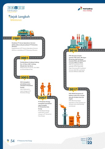 54 PT Pertamina Hulu Energi 2022Laporan TahunanAnnual ReportProfil PerusahaanCompany ProfileJejak LangkahMilestonesPendirian PT Aroma Operations Services (AOS) selaku anak perusahaan PT Pertamina (Persero).Establishment of PT Aroma Operations Services (AOS) as a subsidiary of PT Pertamina (Persero).Pemberlakuan Undang-Undang No. 22 Tahun 2001 tentang Minyak dan Gas Bumi.Enforcement of Law No. 22 of 2001 on Oil and Natural Gas.AOS mengalami perubahan nama menjadi PT Pertahulu Energy.AOS underwent a name change to PT Pertahulu Energy.PT Pertahulu Energy mengalami perubahan nama menjadi PT Pertamina Hulu Energi.PT Pertahulu Energy underwent a name change to PT Pertamina Hulu Energi. PHE efektif beroperasi di bidang usaha hulu minyak dan gas di dalam dan luar negeri.PHE effectively began operations in the upstream oil and gas sector domestically and abroad.PHE ditunjuk menjadi operator WK Tuban, WK Ogan Komering, WK Southeast Sumatra (SES), dan WK North Sumatra Offshore (NSO).PHE was appointed as the operator of the Tuban WK, Ogan Komering WK, Southeast Sumatra (SES) WK, and North Sumatra Offshore (NSO) WK.198920012002200720172018