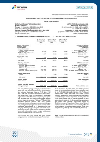 PT Pertamina Hulu Energi 543 2022The original consolidated financial statements included herein are in the Indonesian language.PT PERTAMINA HULU ENERGI TBK DAN ENTITAS ANAK/AND SUBSIDIARIES Daftar 5/104 ScheduleCATATAN ATAS LAPORAN KEUANGANKONSOLIDASIANTanggal 31 Desember 2022, 2021, dan 2020serta Untuk Tahun yang Berakhir padaTanggal-Tanggal 31 Desember 2020, 2021, dan 2020(Disajikan dalam ribuan dolar Amerika Serikat, kecuali dinyatakan lain)NOTES TO THE CONSOLIDATEDFINANCIAL STATEMENTSAs of December 31, 2022, 2021, and 2020and For The Years Ended December 31, 2022, 2021, and 2020 (Expressed in thousands of United States dollars,unless otherwise stated)7. KAS YANG DIBATASI PENGGUNAANNYA (lanjutan) 7. RESTRICTED CASH (continued) 31 Desember/ 31 Desember/ 31 Desember/ December 31, December 31, December 31, 2022 2021 2020 Bagian tidak lancar Non-current portionRekening rupiah: Rupiah accounts:Entitas berelasi Government dengan Pemerintah related entities- PT Bank Negara Indonesia PT Bank Negara Indonesia - (Persero) Tbk. 33.674 29.295 23.941 (Persero) Tbk.- PT Bank Rakyat Indonesia PT Bank Rakyat Indonesia - (Persero) Tbk. 3.747 3.345 4.329 (Persero) Tbk.Entitas pihak ketiga Third party entities- Lainnya 7.119 7.774 8.131 Other - Sub jumlah 44.540 40.414 36.401 Sub totalRekening dolar AS: US dollar accounts:Entitas berelasi Related parties- PT Bank Rakyat Indonesia PT Bank Rakyat Indonesia -(Persero) Tbk. 793.896 440.008 382.308 (Persero) Tbk.- PT Bank Negara Indonesia PT Bank Negara Indonesia - (Persero) Tbk. 441.366 336.905 34.694 (Persero) Tbk.- PT Bank Mandiri (Persero) Tbk. 306.514 304.113 1.223 PT Bank Mandiri (Persero) Tbk. -Entitas pihak ketiga Third party entities- Lainnya - 1.498 2.294 Other - Sub jumlah 1.541.776 1.082.524 420.519 Sub totalJumlah bagian Total non-current tidak lancar 1.586.316 1.122.938 456.920 portionJumlah kas yang dibatasi Penggunaannya 1.628.572 1.138.533 477.953 Total restricted cashKas yang dibatasi penggunaannya per 31 Desember 2022, 2021, dan 2020 merupakan dana biaya restorasi dan reklamasi lingkungan hidup di PHE NSO, PHE WMO, PHE Siak, PEP, PHE Jambi Merang, PHE ONWJ, PHR, PHE OSES, PHE OK, dan PHE RT, sedangkan bagian lancar untuk PHE WMO merupakan pendapatan atas penjualan gas yang belum didistribusikan kepada partner. Bagian lancar untuk PDSI dan PT Badak NGL. digunakan sebagai jaminan atas bank garansi sehubungan kontrak unit pengeboran dan proyek dengan para pelanggan Grup. Bagian tidak lancar untuk ELNUSA merupakan klaim deposito ke PT Bank Mega Tbk. dankas yang dibatasi penggunaannya di bank pihak ketiga.Bagian lancar untuk entitas lainnya merupakan deposito yang wajib ditempatkan dalam rangka pelaksanaan program kerja entitas dan joint study Grup. As at December 31, 2022, 2021, and 2020 represents funds for environmental restoration and reclamation costs for the PHE NSO, PHE WMO, PHE Siak, PEP, PHE Jambi Merang, PHE ONWJ, PHR, PHE OSES, PHE OK and PHE RT, while current portion for PHE WMO represents undistributed gas revenue to partners. Current portion forPDSI and PT Badak NGL. is used as collateral for bank guarantees in relation to the Group%u2019s drilling rig contractsand project with customer. Non-current portion forELNUSA is a claim of deposits to PT Bank Mega Tbk. and restricted cash in third parties bank. Current portion for other entities is the required deposit related to the work programs and joint study to be carried out by the Group. Lihat Catatan 44b untuk jumlah kas yang dibatasi penggunaannya - entitas berelasi dengan Pemerintah.Refer to Note 44b for total restricted cash - Government related entities.