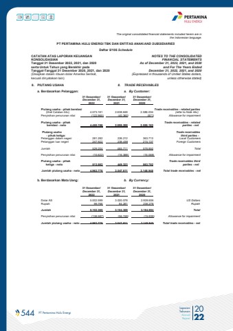 544 PT Pertamina Hulu Energi 2022Laporan TahunanAnnual ReportThe original consolidated financial statements included herein are in the Indonesian language.PT PERTAMINA HULU ENERGI TBK DAN ENTITAS ANAK/AND SUBSIDIARIES Daftar 5/105 ScheduleCATATAN ATAS LAPORAN KEUANGANKONSOLIDASIANTanggal 31 Desember 2022, 2021, dan 2020serta Untuk Tahun yang Berakhir padaTanggal-Tanggal 31 Desember 2020, 2021, dan 2020(Disajikan dalam ribuan dolar Amerika Serikat, kecuali dinyatakan lain)NOTES TO THE CONSOLIDATEDFINANCIAL STATEMENTSAs of December 31, 2022, 2021, and 2020and For The Years Ended December 31, 2022, 2021, and 2020 (Expressed in thousands of United States dollars,unless otherwise stated)8. PIUTANG USAHA 8. TRADE RECEIVABLESa. Berdasarkan Pelanggan: a. By Customer: 31 Desember/ 31 Desember/ 31 Desember/ December 31, December 31, December 31, 2022 2021 2020 Piutang usaha - pihak berelasi Trade receivables - related parties (lihat Catatan 44c) 4.573.161 2.638.648 2.586.034 (refer to Note 44c)Penyisihan penurunan nilai (122.965) (40.360) (871) Allowance for impairment Piutang usaha - pihak Trade receivables - relatedberelasi - neto 4.450.196 2.598.288 2.585.163 parties - net Piutang usaha Trade receivables- pihak ketiga: third parties -Pelanggan dalam negeri 281.282 226.212 363.713 Local CustomersPelanggan luar negeri 247.922 239.499 215.137 Foreign Customers Jumlah 529.204 465.711 578.850 TotalPenyisihan penurunan nilai (15.622) (16.388) (15.068) Allowance for impairment Piutang usaha - pihak Trade receivables thirdketiga - neto 513.582 449.323 563.782 parties - netJumlah piutang usaha - neto 4.963.778 3.047.611 3.148.945 Total trade receivables - netb. Berdasarkan Mata Uang: b. By Currency: 31 Desember/ 31 Desember/ 31 Desember/ December 31, December 31, December 31, 2022 2021 2020 Dolar AS 5.002.599 3.020.078 2.928.606 US DollarsRupiah 99.766 84.281 236.278 RupiahJumlah 5.102.365 3.104.359 3.164.884 TotalPenyisihan penurunan nilai (138.587) (56.748) (15.939) Allowance for impairment Jumlah piutang usaha - neto 4.963.778 3.047.611 3.148.945 Total trade receivables - net