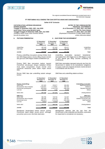 546 PT Pertamina Hulu Energi 2022Laporan TahunanAnnual ReportThe original consolidated financial statements included herein are in the Indonesian language.PT PERTAMINA HULU ENERGI TBK DAN ENTITAS ANAK/AND SUBSIDIARIES Daftar 5/107 ScheduleCATATAN ATAS LAPORAN KEUANGANKONSOLIDASIANTanggal 31 Desember 2022, 2021, dan 2020serta Untuk Tahun yang Berakhir padaTanggal-Tanggal 31 Desember 2020, 2021, dan 2020(Disajikan dalam ribuan dolar Amerika Serikat, kecuali dinyatakan lain)NOTES TO THE CONSOLIDATEDFINANCIAL STATEMENTSAs of December 31, 2022, 2021, and 2020and For The Years Ended December 31, 2022, 2021, and 2020 (Expressed in thousands of United States dollars,unless otherwise stated)9. PIUTANG PEMERINTAH 9. DUE FROM THE GOVERNMENT 31 Desember/ 31 Desember/ 31 Desember/ December 31, December 31, December 31, 2022 2021 2020 Underlifting 497.448 421.423 376.611 Underlifting DMO fees 132.140 306.796 136.755 DMO feesJumlah 629.588 728.219 513.366 Total Piutang underlifting merupakan piutang Entitas Anak dari SKK Migas karena volume lifting minyak mentah dan gas bumi SKK Migas melebihi entitlement-nya. Underlifting receivables represent Subsidiaries%u2019 receivables from SKK Migas due to SKK Migas%u2019s crude oil and natural gas lifting volumes exceeding its entitlements.Piutang DMO fees merupakan tagihan kepada Pemerintah sehubungan dengan kewajiban Entitas Anak dalam menyediakan minyak mentah untuk memenuhi kebutuhan pasar dalam negeri sesuai KBH.DMO fees receivables represent amounts due from the Government in relation to the Subsidiaries%u2019 obligations to supply crude oil to meet the domestic market demand in accordance with the PSCs. Rincian DMO fees dan underlifting adalah sebagai berikut:DMO fees and underlifting details as follo 31 Desember/ 31 Desember/ 31 Desember/ December 31, December 31, December 31, 2022 2021 2020 Piutang Underlifting: Underlifting receivable:Saldo awal 421.423 376.611 264.395 Beginning balancePenambahan tahun berjalan 1.044.874 1.118.081 581.570 AdditionsPenerimaan pembayaran (920.084) (1.074.707) (496.250) Payment receivedLain-lain (48.765) 1.438 26.896 OthersSaldo akhir 497.448 421.423 376.611 Ending balanceDMO fees: DMO fees:Saldo awal 306.796 136.755 154.367 Beginning balancePenambahan tahun berjalan 493.296 356.302 337.421 Additions during the yearPenerimaan tunai (659.421) (175.319) (345.345) Cash receivedLain-lain (8.531) (10.942) (9.688) OtherSaldo akhir 132.140 306.796 136.755 Ending balanceJumlah 629.588 728.219 513.366 TotalManajemen berpendapat bahwa seluruh piutang Pemerintah dapat ditagih secara penuh, sehingga penyisihan penurunan nilai tidak diperlukan.Management believes that the due from the Government is fully collectible and therefore, a provision for impairment is considered not necessary.