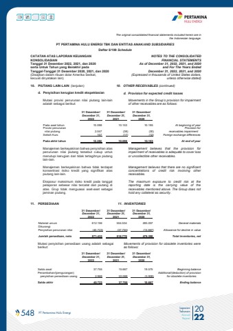 548 PT Pertamina Hulu Energi 2022Laporan TahunanAnnual ReportThe original consolidated financial statements included herein are in the Indonesian language.PT PERTAMINA HULU ENERGI TBK DAN ENTITAS ANAK/AND SUBSIDIARIES Daftar 5/109 ScheduleCATATAN ATAS LAPORAN KEUANGANKONSOLIDASIANTanggal 31 Desember 2022, 2021, dan 2020serta Untuk Tahun yang Berakhir padaTanggal-Tanggal 31 Desember 2020, 2021, dan 2020(Disajikan dalam ribuan dolar Amerika Serikat, kecuali dinyatakan lain)NOTES TO THE CONSOLIDATEDFINANCIAL STATEMENTSAs of December 31, 2022, 2021, and 2020and For The Years Ended December 31, 2022, 2021, and 2020 (Expressed in thousands of United States dollars,unless otherwise stated)10. PIUTANG LAIN-LAIN (lanjutan) 10. OTHER RECEIVABLES (continued)d. Penyisihan kerugian kredit ekspektasian d. Provision for expected credit lossesMutasi provisi penurunan nilai piutang lain-lain adalah sebagai berikut:Movements in the Group%u2019s provision for impairment of other receivables are as follows: 31 Desember/ 31 Desember/ 31 Desember/ December 31, December 31, December 31, 2022 2021 2020 Pada awal tahun 10.098 10.153 10.195 At beginning of yearProvisi penurunan Provision fornilai piutang 2.047 (38) (30) receivables impairmentSelisih Kurs 107 (17) (12) Foreign exchange differencesPada akhir tahun 12.252 10.098 10.153 At end of yearManajemen berkeyakinan bahwa penyisihan atas penurunan nilai piutang tersebut cukup untuk menutupi kerugian dari tidak tertagihnya piutang lain-lain. Manajemen berkeyakinan bahwa tidak terdapat konsentrasi risiko kredit yang signifikan atas piutang lain-lain. Eksposur maksimum risiko kredit pada tanggal pelaporan sebesar nilai tercatat dari piutang di atas. Grup tidak menguasai aset-aset sebagai jaminan piutang.Management believes that the provision for impairment of receivables is adequate to cover lossor uncollectible other receivables.Management believes that there are no significant concentrations of credit risk involving otherreceivables.The maximum exposure to credit risk at the reporting date is the carrying value of the receivables mentioned above. The Group does not hold any collateral as security.11. PERSEDIAAN 11. INVENTORIES 31 Desember/ 31 Desember/ 31 Desember/ December 31, December 31, December 31, 2022 2021 2020 Material umum 612.156 554.534 495.057 General materialsDikurangi: Penyisihan penurunan nilai (40.723) (37.755) (15.667) Allowance for decline in valueJumlah persediaan, neto 571.433 516.779 479.390 Total inventories, netMutasi penyisihan persediaan usang adalah sebagai berikut:Movements of provision for obsolete inventories were as follows: 31 Desember/ 31 Desember/ 31 Desember/ December 31, December 31, December 31, 2022 2021 2020 Saldo awal 37.755 15.667 19.575 Beginning balancePenambahan/(pengurangan) Additional/(deduction) of provision penyisihan persediaan usang 2.968 22.088 (3.908) for obsolete inventoriesSaldo akhir 40.723 37.755 15.667 Ending balance