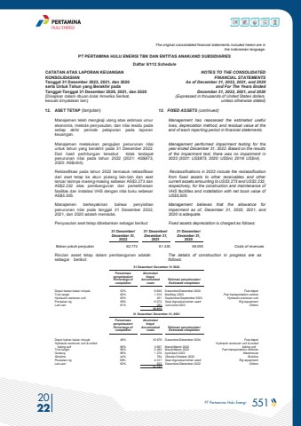 PT Pertamina Hulu Energi 551 2022The original consolidated financial statements included herein are in the Indonesian language.PT PERTAMINA HULU ENERGI TBK DAN ENTITAS ANAK/AND SUBSIDIARIES Daftar 5/112 ScheduleCATATAN ATAS LAPORAN KEUANGANKONSOLIDASIANTanggal 31 Desember 2022, 2021, dan 2020serta Untuk Tahun yang Berakhir padaTanggal-Tanggal 31 Desember 2020, 2021, dan 2020(Disajikan dalam ribuan dolar Amerika Serikat, kecuali dinyatakan lain)NOTES TO THE CONSOLIDATEDFINANCIAL STATEMENTSAs of December 31, 2022, 2021, and 2020and For The Years Ended December 31, 2022, 2021, and 2020 (Expressed in thousands of United States dollars,unless otherwise stated)12. ASET TETAP (lanjutan) 12. FIXED ASSETS (continued)Manajemen telah mengkaji ulang atas estimasi umur ekonomis, metode penyusutan, dan nilai residu pada setiap akhir periode pelaporan pada laporan keuangan.Manajemen melakukan pengujian penurunan nilai untuk tahun yang berakhir pada 31 Desember 2022. Dari hasil perhitungan tersebut tidak terdapat penurunan nilai pada tahun 2022 (2021: AS$873, 2020: AS$nihil).Management has reassesed the estimated useful lives, depreciation method, and residual value at the end of each reporting period in financial statements. Management performed impairment testing for the year ended December 31, 2022. Based on the results of the impairment test, there was no impairment in 2022 (2021: US$873, 2020: US$nil, 2019: US$nil). Reklasifikasi pada tahun 2022 termasuk reklasifikasi dari aset tetap ke akun piutang lain-lain dan aset lancar lainnya masing-masing sebesar AS$3.273 dan AS$2.232 atas pembangunan dan pemeliharaan fasilitas dan instalasi VHS dengan nilai buku sebesar AS$5.505.Reclassifications in 2022 include the reclassification from fixed assets to other receivables and other current assets amounting to US$3,273 and US$2,232, respectively, for the construction and maintenance of VHS facilities and installation with net book value of US$5,505.Manajemen berkeyakinan bahwa penyisihan penurunan nilai pada tanggal 31 Desember 2022, 2021, dan 2020 adalah memadai.Management believes that the allowance for impairment as of, December 31, 2022, 2021, and 2020 is adequate.Penyusutan aset tetap dibebankan sebagai berikut: Fixed assets depreciation is charged as follows: 31 Desember/ 31 Desember/ 31 Desember/ December 31, December 31, December 31, 2022 2021 2020 Beban pokok penjualan 62.772 61.430 58.093 Costs of revenuesRincian asset tetap dalam pembangunan adalah sebagai berikut:The details of construction in progress are as follows: 31 Desember/ December 31 2022 Persentase Akumulasi penyelesaian/ biaya/ Percentage of Accumulated Estimasi penyelesaian/ completion costs Estimated completion Depot bahan bakar minyak 52% 8.600 Desember/December 2024 Fuel depotTruk tangki 65% 1.010 Mei/May 2023 Fuel transportation vehicle Hydraulic workover unit 65% 451 September/September 2023 Hydraulic workover unit Peralatan rig 98% 6.572 Saat digunakan/when used Rig equipmentLain-lain 61% 282 Juni/June 2023 Others 16.915 31 Desember/ December 31, 2021 Persentase Akumulasi penyelesaian/ biaya/ Percentage of Accumulated Estimasi penyelesaian/ completion costs Estimated completion Depot bahan bakar minyak 46% 10.678 Desember/December 2024 Fuel depot Hydraulic workover unit & coiled Hydraulic workover unit & coiled tubing unit 66% 3.697 Maret/March 2022 tubing unit Truk tangki 90% 2.483 Maret/March 2022 Fuel transportation vehiclesGudang 89% 1.270 April/April 2022 WarehouseSlickline 44% 784 Oktober/October 2022 Slickline Peralatan rig 98% 4.317 Saat digunakan/when used Rig equipment Lain-lain 62% 923 Desember/December 2022 Others 24.152