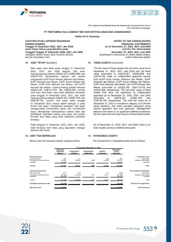 PT Pertamina Hulu Energi 553 2022The original consolidated financial statements included herein are in the Indonesian language.PT PERTAMINA HULU ENERGI TBK DAN ENTITAS ANAK/AND SUBSIDIARIES Daftar 5/114 ScheduleCATATAN ATAS LAPORAN KEUANGANKONSOLIDASIANTanggal 31 Desember 2022, 2021, dan 2020serta Untuk Tahun yang Berakhir padaTanggal-Tanggal 31 Desember 2020, 2021, dan 2020(Disajikan dalam ribuan dolar Amerika Serikat, kecuali dinyatakan lain)NOTES TO THE CONSOLIDATEDFINANCIAL STATEMENTSAs of December 31, 2022, 2021, and 2020and For The Years Ended December 31, 2022, 2021, and 2020 (Expressed in thousands of United States dollars,unless otherwise stated)12. ASET TETAP (lanjutan) 12. FIXED ASSETS (continued)Nilai wajar aset tetap pada tanggal 31 Desember 2022, 2021, dan 2020 dengan nilai buku masing-masing sebesar AS$33.587, AS$58.896, dan AS$19.700, berdasarkan laporan dari penilai independen KJPP Amin Nirwan Alfiantori dan Rekan, KJPP Iskandar dan Rekan, KJPP Susan Widjojo dan Rekan, KJPP Ruki Safrudin dan Rekan, dan KJPP Asmawi dan Rekan masing-masing adalah sebesar AS$53.230, AS$114.078 dan AS$30.288. Jumlah nilai buku aset tetap yang tidak dilakukan penilaian pada tanggal 31 Desember 2022, 2021, dan 2020masing-masing sebesar AS$76.391, AS$67.979, danAS$108.764, Jumlah nilai wajar pada tanggal 31 Desember 2021 masuk dalam kategori 3 pada hirarki nilai wajar. Pendekatan penilaian nilai wajar menggunakan pendekatan pasar dan pendekatan biaya. Manajemen berkeyakinan bahwa tidak ada perbedaan signifikan antara nilai wajar dan jumlah tercatat aset tetap yang tidak dilakukan penilaian tersebut. The fair value of fixed assets with net book value as of December 31, 2022, 2021, and 2020 with net book value amounted to US$33,587, US$58,896, and US$19,700, base on independent appraisal reportsfrom KJPP Amin Nirwan Alfiantori dan Rekan, KJPP Iskandar dan Rekan, KJPP Susan Widjojo dan Rekan, KJPP Ruki Safrudin dan Rekan, dan KJPP Asmawi dan Rekan amounted to US$53,230, US$114,078 andUS$30,288, respectively. The net book value of fixed assets that were not appraised by independent appraiser as of December 31, 2022, 2021, and 2020amounted to US$76,391, US$67,979, and US$108,764, respectively, The total fair value as of December 31, 2021 is included in category 3 on the fair value hierarchy. Fair value valuation approach using market approach and cost approach. Management believes that there is no significant difference between the fair value and carrying amount of these fixed assets.Pada tanggal 31 Desember 2022, 2021, dan 2020, tidak terdapat aset tetap yang digunakan sebagai jaminan dan hibah.As of December 31, 2022, 2021, and 2020, there is no fixed assets used as collateral and grant. 13. ASET TAK BERWUJUD 13. INTANGIBLE ASSETSMutasi aset tak berwujud adalah sebagai berikut: The movements in intangible assets are as follows: 31 Desember/December 31, 2022 Saldo awal/ Saldo akhir/ Beginning Penambahan/ Pengurangan/ Koreksi/ Ending Balance Additions Deductions Correction Rbalance Biaya perolehan Acquisition CostHak atas tanah 623 13 - (52) 584 Land rightsPerangkat lunak dan lisensi 60.294 26.829 (308) (4.403) 82.412 Software and licenseGoodwill 113.470 - - - 113.470 Goodwill Jumlah 174.387 26.842 (308) (4.455) 196.466 TotalAkumulasi amortisasi Accumulated amortizationHak atas tanah (271) (27) - 24 (274) Land rightsPerangkat lunak dan lisensi (52.164) (14.022) 270 4.411 (61.505) Software and licenseGoodwill (26.755) - - - (26.755) GoodwillJumlah (79.190) (14.049) 270 4.435 (88.534) Total Penyisihan penurunan nilai (33.379) - - - (33.379) Provision for impairmentNilai buku-neto 61.818 74.553 Book value-net