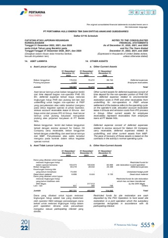PT Pertamina Hulu Energi 555 2022The original consolidated financial statements included herein are in the Indonesian language.PT PERTAMINA HULU ENERGI TBK DAN ENTITAS ANAK/AND SUBSIDIARIES Daftar 5/116 ScheduleCATATAN ATAS LAPORAN KEUANGANKONSOLIDASIANTanggal 31 Desember 2022, 2021, dan 2020serta Untuk Tahun yang Berakhir padaTanggal-Tanggal 31 Desember 2020, 2021, dan 2020(Disajikan dalam ribuan dolar Amerika Serikat, kecuali dinyatakan lain)NOTES TO THE CONSOLIDATEDFINANCIAL STATEMENTSAs of December 31, 2022, 2021, and 2020and For The Years Ended December 31, 2022, 2021, and 2020 (Expressed in thousands of United States dollars,unless otherwise stated)14. ASET LAINNYA 14. OTHER ASSETSa. Aset Lancar Lainnya a. Other Current Assets 31 Desember/ 31 Desember/ 31 Desember/ December 31, December 31, December 31, 2022 2021 2020 Beban tangguhan 176.634 70.472 88.742 Deferred expensesPiutang karyawan 4.333 - - Employee receivablesJumlah 180.967 70.472 88.742 TotalAset lancar lainnya untuk beban tangguhan terdiri dari time deposit bagian non-operator PHE OG BV, deferred expense terkait biaya restorasi lingkungan hidup PHR dan piutang lain-lain dariunderlifting untuk bagian non-operator di PIEP yang penyelesaian atas saldo tersebut mengacu pada siklus kegiatan operasi di pihak Operator,alokasi account receivable lease di Elnusa dan biaya emisi dari proses IPO di Group. Aset lancar lainnya untuk piutang karyawan merupakan piutang atas pinjaman karyawan di PT Badak NGL.Other current assets for deferred expenses consist of time deposit for the non-operator portion of PHE OG BV, deferred expense related to environmental restoration costs in PHR and other receivables from underlifting for non-operators in PIEP whose settlement of the balance refers to the operating cycle on the operator's side, allocation account receivable lease in Elnusa and emission costs from IPO processin Group. Other current assets for employee receivables represent receivables from employee loans at PT Badak NGL.Beban tangguhan terdiri dari beban tangguhan terkait dengan escrow account for Gabon Oil Company carry receivable, beban tangguhan terkait dengan underlifting, dan aset lancar lainnya dari M&P. Penyelesaian atas saldo tersebut mengacu pada kontrak dalam siklus kegiatan operasi normal. Deferred expense consist of deferred expenses related to escrow account for Gabon Oil Company carry receivable, deferred expenses related to underlifting, and other current assets from M&P. The pace of recovery of these assets is based on the contracts in the activity%u2019s normal operating cycle.b. Aset Tidak Lancar Lainnya b. Other Non-Current Assets 31 Desember/ 31 Desember/ 31 Desember/ December 31, December 31, December 31, 2022 2021 2020 Dana yang dibatasi untuk tujuan restorasi lingkungan hidup Restricted funds for dalam operasi bersama 103.573 100.635 82.806 site restoration in joint operationBeban tangguhan 83.219 28.532 25.359 Deferred expenses Keuntungan lindung nilai yang belum terealisasi 73.400 - - Unrealized hedge profitDead stock material 6.698 6.444 5.120 Dead stock materialDana yang dibatasi untuk tujuan restorasi lingkungan hidup Restricted funds for site restorationyang belum dialihkan oleh which has not been transferredSKK Migas - 317.512 - by the SKK MigasLain - lain 831 485 758 OthersJumlah 267.721 453.608 114.043 TotalDana yang dibatasi untuk tujuan restorasi lingkungan hidup adalah kas yang disetorkan oleh operator KBH sebagai pencadangan dana terkait untuk restorasi lingkungan hidup dalam joint operation dimana anak perusahaan mengakui sesuai participating interest yang dimiliki.Restricted funds for site restoration are cash deposited by the PSC Operators to fund asset site restoration in a joint operation which the subsidiary companies recognizes in accordance with its participating interest.