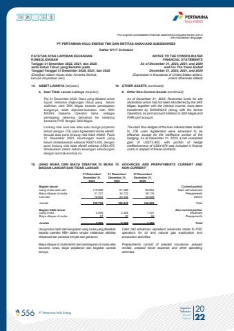 556 PT Pertamina Hulu Energi 2022Laporan TahunanAnnual ReportThe original consolidated financial statements included herein are in the Indonesian language.PT PERTAMINA HULU ENERGI TBK DAN ENTITAS ANAK/AND SUBSIDIARIES Daftar 5/117 ScheduleCATATAN ATAS LAPORAN KEUANGANKONSOLIDASIANTanggal 31 Desember 2022, 2021, dan 2020serta Untuk Tahun yang Berakhir padaTanggal-Tanggal 31 Desember 2020, 2021, dan 2020(Disajikan dalam ribuan dolar Amerika Serikat, kecuali dinyatakan lain)NOTES TO THE CONSOLIDATEDFINANCIAL STATEMENTSAs of December 31, 2022, 2021, and 2020and For The Years Ended December 31, 2022, 2021, and 2020 (Expressed in thousands of United States dollars,unless otherwise stated)14. ASSET LAINNYA (lanjutan) 14. OTHER ASSETS (continued)b. Aset Tidak Lancar Lainnya (lanjutan) b. Other Non-Current Assets (continued)Per 31 Desember 2022, Dana yang dibatasi untuk tujuan restorasi lingkungan hidup yang belum dialihkan oleh SKK Migas beserta pendapatan bunganya, telah dipindah-bukukan oleh SKK MIGAS (beserta Operator lama, sebagai pemegang rekening bersama) ke rekening bersama PHR dengan SKK Migas.As of December 31, 2022, Restricted funds for site restoration which has not been transferred by the SKK Migas, together with the interest income, have been transferred by SKKMIGAS (along with the former Operators, as joint account holders) to SKK Migas and PHR joint account.Lindung nilai arus kas atas suku bunga pinjaman terkait dengan JTB Loan Agreement dinilai efektif, kecuali atas porsi lindung nilai tidak efektif. Pada 31 Desember 2022, keuntungan bersih yang belum direalisasikan sebesar AS$73.400, dengan porsi lindung nilai tidak efektif sebesar AS$4.670dimasukkan dalam beban keuangan sehubungan dengan kontrak-kontrak ini.The cash flow hedges of the loan interest rates related to JTB Loan Agreement were assessed to be effective, except for the ineffective portion of the hedging. As at December 31, 2022, a net unrealizedgain of US$73,400, with portion of hedge ineffectiveness of US$4,670 was included in finance costs in respect of these contracts. 15. UANG MUKA DAN BIAYA DIBAYAR DI MUKABAGIAN LANCAR DAN TIDAK LANCAR15. ADVANCES AND PREPAYMENTS CURRENT AND NON-CURRENT 31 Desember/ 31 Desember/ 31 Desember/ December 31, December 31, December 31, 2022 2021 2020 Bagian lancar Current portionUang muka cash call 119.696 61.369 66.804 Cash call advancesBiaya dibayar di muka 21.221 34.722 58.116 PrepaymentsLain-lain 18.842 24.552 32.008 OthersJumlah 159.759 120.643 156.928 TotalBagian tidak lancar Non-current portionUang muka 2.036 2.228 1.437 AdvancesBiaya dibayar di muka 57 57 56 PrepaymentsJumlah 2.093 2.285 1.493 TotalUang muka cash call merupakan uang muka yang diberikan kepada operator KBH dalam rangka melakukan aktivitas eksplorasi dan produksi minyak dan gas bumi.Cash call advances represent advances made to PSC operators for oil and natural gas exploration and production activities.Biaya dibayar di muka terdiri dari pembayaran di muka atas asuransi, sewa, biaya perjalanan dan kegiatan operasi lainnya.Prepayments consist of prepaid insurance, prepaid rentals, prepaid travel expense and other operating activities.