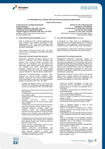 PT Pertamina Hulu Energi 561 2022The original consolidated financial statements included herein are in the Indonesian language.PT PERTAMINA HULU ENERGI TBK DAN ENTITAS ANAK/AND SUBSIDIARIES Daftar 5/122 ScheduleCATATAN ATAS LAPORAN KEUANGANKONSOLIDASIANTanggal 31 Desember 2022, 2021, dan 2020serta Untuk Tahun yang Berakhir padaTanggal-Tanggal 31 Desember 2020, 2021, dan 2020(Disajikan dalam ribuan dolar Amerika Serikat, kecuali dinyatakan lain)NOTES TO THE CONSOLIDATEDFINANCIAL STATEMENTSAs of December 31, 2022, 2021, and 2020and For The Years Ended December 31, 2022, 2021, and 2020 (Expressed in thousands of United States dollars,unless otherwise stated)17. ASET MINYAK DAN GAS BUMI (lanjutan) 17. OIL AND GAS PROPERTIES (continued)Pada 31 Desember 2022, terdapat kapitalisasi atas biaya pinjaman atas fasilitas pembiayaan proyek pengembangan JTB. Total biaya pinjaman yang dikapitalisasi sebesar AS$69.510 (2021: AS$47.416dan 2020: AS$16.588).Pada tanggal 31 Desember 2022, 2021, dan 2020, seluruh sumur, perlengkapan dan fasilitas terkait telahdiasuransikan.In December 31, 2022, there is a capitalization of borrowing costs for financing facilities for JTB project development. Total capitalized borrowing costs are US$69,510 (2021: US$47,416 and 2020: US$16,588).As at December 31, 2022, 2021, and 2020, all wells and related equipment and facilities were already insured.Penurunan nilai aset minyak dan gas bumi Impairment of oil and gas propertiesManajemen melakukan pengujian penurunan nilai pada 31 Desember 2022 untuk beberapa blok produksi yang memiliki indikasi penurunan nilai.Dalam hal ini, manajemen Grup menentukan hak kepemilikan pada masing-masing blok sebagai satu Unit Penghasil Kas (UPK). Berdasarkan hasil pengujian, terdapat penurunan nilai pada tanggal 31 Desember 2022, 2021, dan 2020, masing-masing sebesar AS$169.734, AS$144.406 dan AS$538.653. Management performed impairment testing on December 31, 2022 for several production blocks which has impairment indicators. For this purpose, the Group%u2019s management determines that a participating interest in a block as a Cash Generating Unit (CGUs). Based on the results of the impairment test, there were impairment adjustments recognized on December 31, 2022, 2021, and 2020 amounted to US$169,734, US$144,406 andUS$538,653, respectively. Manajemen mempertimbangkan berbagai faktor eksternal dan internal ketika melakukan kajian indikator penurunan nilai, berikut adalah indikator yang menyebabkan penurunan nilai yang terjadi pada tanggal 31 Desember 2022, 2021, dan 2020. - Terdapat pembatalan proyek sumur eksplorasi PHE-N9 dan pembatalan pengembangan atas temuan sumur eksplorasi PHE-11D di PHE WMO;- Berhentinya produksi dari sumur produksi di PHE Randugunting;- Terdapat penurunan reserve pada PHE NSO atas hasil sertifikasi D&M;- Terdapat delay on stream pada PHE Nunukan ke TW IV 2026;- Terdapat penurunan reserve pada PHE Simenggaris dan mundurnya proyek kayan LNG ke 2023;- Terdapat penurunan proyeksi harga minyak dunia yang cukup signifikan di tahun 2020 dan 2021; - Terdapat penurunan produksi akibat laju penurunan alami dari lapangan-lapangan eksisting di masing-masing blok yang terdampak;- Adanya covid outbreak yang berdampak pada kegiatan operasi beberapa blok di tahun 2021;- Terdapat penurunan estimasi kontinjen (kontinjen 2c) berdasarkan hasil post-drill sumur delineasi pada wilayah Parang 1 dan Parang 2 pada blok Nunukan di tahun 2021;- Adanya rencana menghentikan operasi di blok Kakap oleh operator tahun 2022; dan- Adanya penurunan komersialisasi gas keekonomian akibat pengenaan bea keluar dan pajak penjualan Sarawak & Sabah yang ditanggung dari peraturan pemerintah Malaysia untuk Blok K PIMEP di tahun 2021.Management considers various external and internal factors when reviewing indicators of impairment, the following are indicators that cause impairment that occurred on December 31, 2022, 2021, and 2020. - There are project cancellation of PHE N-9 exploration well and cancellation of development towards discovery of PHE-11D exploration well in PHE WMO; - A production discontinuation of producing well in PHE Randugunting; - There is a decrease in reserves at PHE NSO based on the results of D&M certification; - There is a delay on stream on PHE Nunukan to Quarter IV 2026;- There is a decrease in reserves at PHE Simenggaris and the delay of the Kayal LNG project to 2023- There is significant decline in world oil priceprojections in 2020 and 2021;- There is a decrease in production due to natural declining rate from the existing fields from such respective blocks;- The existence of a covid outbreak that has an impact to the operational activities for several blocks in 2021;- There is a decrease in the estimated continjent (contingent 2c) based on the post-drill results of delineation wells in the Parang 1 and Parang 2 areas in the Nunukan block in 2021;- There is a plan to stop the operations in Kakap Block by the operator in 2022; and- There is a decrease in economic gas commercialization due to the imposition of export duties and sales tax on Sarawak & Sabah which are borne by the Malaysian government regulations for Block K PIMEP in 2021.