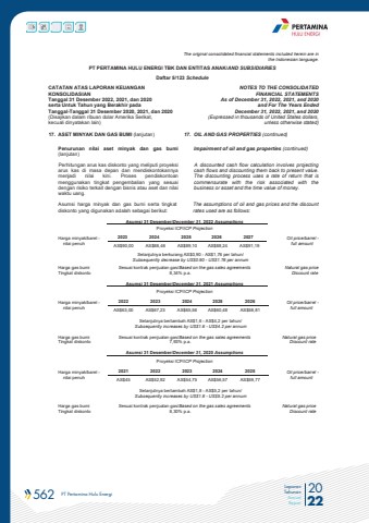 562 PT Pertamina Hulu Energi 2022Laporan TahunanAnnual ReportThe original consolidated financial statements included herein are in the Indonesian language.PT PERTAMINA HULU ENERGI TBK DAN ENTITAS ANAK/AND SUBSIDIARIES Daftar 5/123 ScheduleCATATAN ATAS LAPORAN KEUANGANKONSOLIDASIANTanggal 31 Desember 2022, 2021, dan 2020serta Untuk Tahun yang Berakhir padaTanggal-Tanggal 31 Desember 2020, 2021, dan 2020(Disajikan dalam ribuan dolar Amerika Serikat, kecuali dinyatakan lain)NOTES TO THE CONSOLIDATEDFINANCIAL STATEMENTSAs of December 31, 2022, 2021, and 2020and For The Years Ended December 31, 2022, 2021, and 2020 (Expressed in thousands of United States dollars,unless otherwise stated)17. ASET MINYAK DAN GAS BUMI (lanjutan) 17. OIL AND GAS PROPERTIES (continued)Penurunan nilai aset minyak dan gas bumi (lanjutan)Impairment of oil and gas properties (continued)Perhitungan arus kas diskonto yang meliputi proyeksi arus kas di masa depan dan mendiskontokannya menjadi nilai kini. Proses pendiskontoan menggunakan tingkat pengembalian yang sesuai dengan risiko terkait dengan bisnis atau aset dan nilai waktu uang.A discounted cash flow calculation involves projecting cash flows and discounting them back to present value. The discounting process uses a rate of return that is commensurate with the risk associated with the business or asset and the time value of money.Asumsi harga minyak dan gas bumi serta tingkat diskonto yang digunakan adalah sebagai berikut:The assumptions of oil and gas prices and the discount rates used are as follows: Asumsi 31 Desember/December 31, 2022 Assumptions Proyeksi ICP/ICP ProjectionHarga minyak/barel -nilai penuh2023 2024 2025 2026 2027 Oil price/barrel -full amount AS$90,00 AS$88,46 AS$89,10 AS$88,24 AS$91,19Selanjutnya berkurang AS$0,90 - AS$1,76 per tahun/Subsequently decrease by US$0.90 - US$1.76 per annumHarga gas bumi Sesuai kontrak penjualan gas/Based on the gas sales agreements Natural gas price Tingkat diskonto 8,34% p.a. Discount rate Asumsi 31 Desember/December 31, 2021 Assumptions Proyeksi ICP/ICP ProjectionHarga minyak/barel -nilai penuh2022 2023 2024 2025 2026 Oil price/barrel -full amount AS$63,00 AS$67,23 AS$65,56 AS$60,48 AS$58,81Selanjutnya bertambah AS$1,6 - AS$4,2 per tahun/Subsequently increases by US$1.6 - US$4.2 per annumHarga gas bumi Sesuai kontrak penjualan gas/Based on the gas sales agreements Natural gas price Tingkat diskonto 7,93% p.a. Discount rate Asumsi 31 Desember/December 31, 2020 Assumptions Proyeksi ICP/ICP ProjectionHarga minyak/barel -nilai penuh2021 2022 2023 2024 2025 Oil price/barrel -full amount AS$45 AS$52,92 AS$54,75 AS$56,57 AS$59,77Selanjutnya bertambah AS$1,8 - AS$5,2 per tahun/Subsequently increases by US$1.8 - US$5.2 per annumHarga gas bumi Sesuai kontrak penjualan gas/Based on the gas sales agreements Natural gas price Tingkat diskonto 8,30% p.a. Discount rate