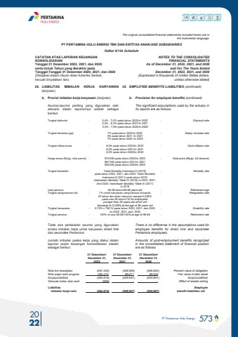 PT Pertamina Hulu Energi 573 2022The original consolidated financial statements included herein are in the Indonesian language.PT PERTAMINA HULU ENERGI TBK DAN ENTITAS ANAK/AND SUBSIDIARIES Daftar 5/134 ScheduleCATATAN ATAS LAPORAN KEUANGANKONSOLIDASIANTanggal 31 Desember 2022, 2021, dan 2020serta Untuk Tahun yang Berakhir padaTanggal-Tanggal 31 Desember 2020, 2021, dan 2020(Disajikan dalam ribuan dolar Amerika Serikat, kecuali dinyatakan lain)NOTES TO THE CONSOLIDATEDFINANCIAL STATEMENTSAs of December 31, 2022, 2021, and 2020and For The Years Ended December 31, 2022, 2021, and 2020 (Expressed in thousands of United States dollars,unless otherwise stated)25. LIABILITAS IMBALAN KERJA KARYAWAN (lanjutan)25. EMPLOYEE BENEFITS LIABILITIES (continued)b. Provisi imbalan kerja karyawan (lanjutan) b. Provision for employee benefits (continued)Asumsi-asumsi penting yang digunakan oleh aktuaris dalam laporannya adalah sebagai berikut:The significant assumptions used by the actuary in its reports are as follows: Tingkat diskonto : 3,4% - 7,4% pada tahun 2022/in 2022 : Discount rate 3,4% - 8,2% pada tahun 2021/in 2021 3,2% - 7,8% pada tahun 2020/in 2020 Tingkat kenaikan gaji : 7% pada tahun 2022/in 2022 : Salary increase rate 6% pada tahun 2021 /in 2021 7% pada tahun 2020 /in 2020 Tingkat inflasi emas : 8,0% pada tahun 2022/in 2022 : Gold inflation rate8,0% pada tahun 2021/in 20218,0% pada tahun 2020/in 2020Harga emas (Rp/gr, nilai penuh) : 970.000 pada tahun 2022/in 2022 : Gold price (Rp/gr, full amount)887.500 pada tahun 2021/in 2021936.000 pada tahun 2020/in 2020Tingkat kematian : Tabel Mortalita Indonesia IV (2019) : Mortality ratepada tahun 2022, 2021, dan 2020. Tabel Mortalita Indonesia III (2011) pada tahun 2019/ Indonesian Mortality Table IV (2019) in 2022, 2021, And 2020. Indonesian Mortality Table III (2011) in 2019Usia pensiun : 56-58 tahun/56-58 years old : Retirement age Tingkat pengunduran diri : 1% untuk karyawan yang berusia di bawah : Resignation rate 20 tahun dan akan menurun sampai 0,028% pada usia 56 tahun/ 1% for employees younger than 20 years-old which will decrease to 0,028% at the age of 56 years old Tingkat kecacatan : 0,75% x TMI IV pada tahun 2022, 2021, dan 2020 : Disability rate /in 2022, 2021, and 2020 Tingkat pensiun : 100% di usia 56-58/100% at age of 56-58 : Retirement rateTidak ada perbedaan asumsi yang digunakan antara imbalan kerja untuk karyawan direct hire dan secondee Pertamina.There is no difference in the assumptions used for employee benefits for direct hire and secondee Pertamina employees.Jumlah imbalan paska kerja yang diakui dalam laporan posisi keuangan konsolidasian adalah sebagai berikut:Amounts of post-employment benefits recognized in the consolidated statement of financial position are as follows: 31 Desember/ 31 Desember/ 31 Desember/ December 31, December 31, December 31, 2022 2021 2020 Nilai kini kewajiban (557.225) (308.948) (266.840) Present value of obligationNilai wajar aset program 293.410 99.011 66.033 Fair value of plan assetSurplus/(defisit) (263.815) (209.937) (200.807) Surplus/(deficit)Dampak batas atas aset (859) - - Effect of assets ceilingLiabilitas Employeeimbalan kerja neto (264.674) (209.937) (200.807) benefit liabilities net