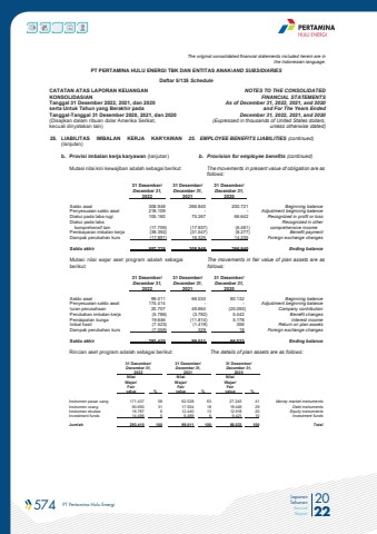 574 PT Pertamina Hulu Energi 2022Laporan TahunanAnnual ReportThe original consolidated financial statements included herein are in the Indonesian language.PT PERTAMINA HULU ENERGI TBK DAN ENTITAS ANAK/AND SUBSIDIARIES Daftar 5/135 ScheduleCATATAN ATAS LAPORAN KEUANGANKONSOLIDASIANTanggal 31 Desember 2022, 2021, dan 2020serta Untuk Tahun yang Berakhir padaTanggal-Tanggal 31 Desember 2020, 2021, dan 2020(Disajikan dalam ribuan dolar Amerika Serikat, kecuali dinyatakan lain)NOTES TO THE CONSOLIDATEDFINANCIAL STATEMENTSAs of December 31, 2022, 2021, and 2020and For The Years Ended December 31, 2022, 2021, and 2020 (Expressed in thousands of United States dollars,unless otherwise stated)25. LIABILITAS IMBALAN KERJA KARYAWAN (lanjutan)25. EMPLOYEE BENEFITS LIABILITIES (continued)b. Provisi imbalan kerja karyawan (lanjutan) b. Provision for employee benefits (continued)Mutasi nilai kini kewajiban adalah sebagai berikut: The movements in present value of obligation are as follows: 31 Desember/ 31 Desember/ 31 Desember/ December 31, December 31, December 31, 2022 2021 2020 Saldo awal 308.948 266.840 200.721 Beginning balancePenyesuaian saldo awal 218.109 - - Adjustment beginning balanceDiakui pada laba rugi 105.160 75.267 66.642 Recognized in profit or lossDiakui pada laba Recognized in otherkomprehensif lain (17.709) (17.937) (6.481) comprehensive incomePembayaran imbalan kerja (39.392) (31.547) (8.277) Benefit paymentDampak perubahan kurs (17.891) 16.325 14.235 Foreign exchange changesSaldo akhir 557.225 308.948 266.840 Ending balanceMutasi nilai wajar aset program adalah sebagai berikut:The movements in fair value of plan assets are as follows: 31 Desember/ 31 Desember/ 31 Desember/ December 31, December 31, December 31, 2022 2021 2020 Saldo awal 99.011 66.033 80.132 Beginning balancePenyesuaian saldo awal 174.414 - - Adjustment beginning balanceIuran perusahaan 20.707 49.664 (25.093) Company contributionPerubahan imbalan kerja (5.786) (3.782) 5.442 Benefit changesPendapatan bunga 19.646 (11.814) 5.178 Interest incomeImbal hasil (7.523) (1.419) 356 Return on plan assetsDampak perubahan kurs (7.059) 329 18 Foreign exchange changesSaldo akhir 293.410 99.011 66.033 Ending balanceRincian aset program adalah sebagai berikut: The details of plan assets are as follows: 31 Desember/ 31 Desember/ 31 Desember/ December 31, December 31, December 31, 2022 2021 2020 Nilai Nilai Nilai Wajar/ Wajar/ Wajar/ Fair Fair Fair value % value % value % Instrumen pasar uang 171.437 58 62.528 63 27.245 41 Money market instrumentsInstrumen utang 90.690 31 17.554 18 19.449 29 Debt instrumentsInstrumen ekuitas 16.787 6 12.440 13 12.918 20 Equity instrumentsInvestment funds 14.496 5 6.489 6 6.421 10 Investment funds Jumlah 293.410 100 99.011 100 66.033 100 Total