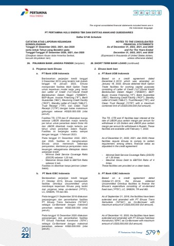 PT Pertamina Hulu Energi 579 2022The original consolidated financial statements included herein are in the Indonesian language.PT PERTAMINA HULU ENERGI TBK DAN ENTITAS ANAK/AND SUBSIDIARIES Daftar 5/140 ScheduleCATATAN ATAS LAPORAN KEUANGANKONSOLIDASIANTanggal 31 Desember 2022, 2021, dan 2020serta Untuk Tahun yang Berakhir padaTanggal-Tanggal 31 Desember 2020, 2021, dan 2020(Disajikan dalam ribuan dolar Amerika Serikat, kecuali dinyatakan lain)NOTES TO THE CONSOLIDATEDFINANCIAL STATEMENTSAs of December 31, 2022, 2021, and 2020and For The Years Ended December 31, 2022, 2021, and 2020 (Expressed in thousands of United States dollars,unless otherwise stated)26. PINJAMAN BANK JANGKA PENDEK (lanjutan) 26. SHORT TERM BANK LOANS (continued)2. Pinjaman bank Elnusa 2. Elnusa bank loana. PT Bank UOB Indonesia a. PT Bank UOB IndonesiaBerdasarkan perjanjian kredit tanggal 3 Desember 2015 yang terakhir kali diubah tanggal 18 Januari 2022, Elnusamemperoleh fasilitas Multi Option Tradeuntuk keperluan modal kerja yang terdiri dari Letter of Credit (%u201cLC%u201d)/Surat Kredit Berdokumen Dalam Negeri (%u201cSKBDN%u201d), BEP-Buyer, Invoice Financing (%u201cIF%u201d), Bank Guarantee (%u201cBG%u201d), Revolving Credit Facility(%u201cRCF%u201d), Standby Letter of Credit (%u201cSBLC%u201d), Trust Receipt (%u201cTR%u201d), dan Clean Trust Receipt (%u201cCTR%u201d) dengan batas maksimum gabungan sebesar AS$20.000.000 (nilai penuh).Based on a credit agreement dated December 3, 2015 which was amended on January 18, 2022, Elnusa obtained Multi Option Trade facilities for working capital purposes consisting of Letter of Credit (%u201cLC%u201d)/Surat Kredit Berdokumen Dalam Negeri (%u201cSKBDN%u201d), BEPBuyer, Invoice Financing (%u201cIF%u201d), Bank Guarantee (%u201cBG%u201d), Revolving Credit Facility (%u201cRCF%u201d), Standby Letter of Credit (%u201cSBLC%u201d), Trust Receipt (%u201cTR%u201d), and Clean Trust Receipt (%u201cCTR%u201d) with a maximum combined limit of US$20,000,000 (full amount).Fasilitas TR, CTR dan IF dikenakan bunga sebesar LIBOR ditambah marjin tertentu per tahun untuk penarikan dalam Dolar AS dan JIBOR ditambah marjin tertentu per tahun untuk penarikan dalam Rupiah. Fasilitas ini berjangka waktu sampai dengan tanggal 1 Februari 2023.The TR, CTR and IF facilities bear interest at the rate of LIBOR plus certain margin per annum for withdrawal in US Dollars and JIBOR plus certain margin per annum for withdrawal in Rupiah. These facilities are available until February 1, 2023.Pada tanggal 31 Desember 2022, 2021, dan 2020, fasilitas ini mengharuskan Elnusa untuk memenuhi beberapa persyaratan, diantaranya persyaratan rasio keuangan sebagaimana ditetapkan dalam perjanjian kredit: - Minimal Debt Service Coverage Ratio (DSCR) sebesar 1,25 kali.- Maksimal Gross Debt to EBITDA Ratio sebesar 4 kali. Fasilitas ini diberikan tanpa jaminan (cleanbasis).As of December 31, 2022, 2021, dan 2020, these facilities require Elnusa to comply to certain requirement, among others, financial ratios as stipulated in the credit agreement: - Minimal Debt Service Coverage Ratio (DSCR) of 1.25 times.- Maximal Gross Debt to EBITDA Ratio of 4 times.These facilities are provided on a clean-basis.b. PT Bank ICBC Indonesia b. PT Bank ICBC Indonesia Berdasarkan perjanjian kredit tanggal 21 Oktober 2015, Elnusa memperoleh fasilitas Omnibus Uncommitted untuk membiayai keperluan Elnusa yang terdiri dari pinjaman tetap on-demand (%u201cPTD%u201d), LC, SKBDN, TR dan BG.Based on a credit agreement dated October 21, 2015, the Elnusa obtained Uncommitted Omnibus facilities to finance the Elnusa%u2019s expenditure consisting of on-demand fixed loan (%u201cPTD%u201d), LC, SKBDN, TR and BG.Pada tanggal 21 September 2016 dilakukan perpanjangan dan penambahan fasilitasPT Elnusa Trans Samudera (%u201cETSA%u201d)sebagai Co-Borrower dengan maksimal penarikan sebesar AS$5.000.000 (nilai penuh).As of September 21, 2016, the facilities have been extended and amended with PT Elnusa Trans Samudera (%u201cETSA%u201d) as Co-Borrower with maximum amount of US$5,000,000 (full amount).Pada tanggal 10 Desember 2020 dilakukan perpanjangan dan penambahan fasilitasPT Elnusa Fabrikasi Konstruksi (%u201cEFK%u201d)sebagai Co-Borrower dengan maksimal penarikan sebesar AS$5.000.000 (nilai penuh).As of December 10, 2020, the facilities have been extended and amended with PT Elnusa Fabrikasi Konstruksi (%u201cEFK%u201d) as Co-Borrower with maximum amount of US$5,000,000 (full amount).