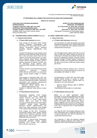 580 PT Pertamina Hulu Energi 2022Laporan TahunanAnnual ReportThe original consolidated financial statements included herein are in the Indonesian language.PT PERTAMINA HULU ENERGI TBK DAN ENTITAS ANAK/AND SUBSIDIARIES Daftar 5/141 ScheduleCATATAN ATAS LAPORAN KEUANGANKONSOLIDASIANTanggal 31 Desember 2022, 2021, dan 2020serta Untuk Tahun yang Berakhir padaTanggal-Tanggal 31 Desember 2020, 2021, dan 2020(Disajikan dalam ribuan dolar Amerika Serikat, kecuali dinyatakan lain)NOTES TO THE CONSOLIDATEDFINANCIAL STATEMENTSAs of December 31, 2022, 2021, and 2020and For The Years Ended December 31, 2022, 2021, and 2020 (Expressed in thousands of United States dollars,unless otherwise stated)26. PINJAMAN BANK JANGKA PENDEK (lanjutan) 26. SHORT TERM BANK LOANS (continued)2. Pinjaman bank Elnusa 2. Elnusa bank loanb. PT Bank ICBC Indonesia (lanjutan) b. PT Bank ICBC Indonesia (continued)Pada tanggal 30 November 2022, fasilitas tersebut dilakukan perpanjangan dan penambahan PT Sigma Cipta Utama (%u201cSCU%u201d)sebagai Co-Borrower dengan maksimal penarikan sebesar AS$5.000.000 (nilai penuh).As of November 30, 2022, the facilities have been extended and amended with PT Sigma Cipta Utama (%u201cSCU%u201d) as Co-Borrower with maximum amount of US$5,000,000 (full amount). Fasilitas PTD dikenakan bunga sebesar biaya pendanaan ICBC ditambah marjin tertentu per tahun untuk penarikan dalam Dolar AS dan sebesar suku bunga tetap tertentu per tahun untuk penarikan dalam Rupiah, sementara fasilitas Usance Payable At Sight (%u201cUPAS%u201d)/ Usance Financing At Maturity (%u201cUFAM%u201d) dan TR dikenakan bunga sebesar biaya pendanaan ICBC ditambah marjin tertentu per tahun.The PTD facility bears interest at the rate of cost of fund of ICBC plus certain margin per annum for withdrawal in US Dollar and at certain fixed rate per annum for withdrawal in Rupiah, while the Usance Payable At Sight (%u201cUPAS%u201d)/ Usance Financing At Maturity (%u201cUFAM%u201d) and TR facilities bear interest at the rate of cost of fund of ICBC plus certain margin per annum.Fasilitas Omnibus Uncommitted dengan batas maksimum gabungan sebesar AS$15.000.000 (nilai penuh), dan akan jatuh tempo sampai dengan tanggal 31 Oktober 2023.Uncommitted Ombinus facilities with a maximum combined limit of US$15,000,000 (full amount) will be available until October 31, 2023.Pada tanggal 31 Desember 2022, 2021, dan 2020, fasilitas ini mengharuskan Elnusa untukmemenuhi beberapa persyaratan, diantaranya persyaratan rasio keuangan sebagaimana ditetapkan dalam perjanjian kredit: - Maksimal Interest Bearing Debt to EBITDA Ratio sebesar 4 kali.Fasilitas ini diberikan tanpa jaminan (cleanbasis).As of December 31, 2022, 2021, dan 2020, these facilities require Elnusa to comply to certain requirement, among others, financial ratios as stipulated in the credit agreement: - Maximal Interest Bearing Debt to EBITDA Ratio of 4 times.These facilities are provided on a clean-basis.c. PT Bank Mandiri (Persero) Tbk. c. PT Bank Mandiri (Persero) Tbk.Berdasarkan perjanjian kredit tanggal 16 November 2018, Elnusa memperoleh fasilitas non-cash loan yang terdiri dari Standby Letter of Credit (%u201cSBLC%u201d)/Bank Garansi (%u201cBG%u201d), dan Letter of Credit(%u201cLC%u201d)/Surat Kredit Berdokumen Dalam Negeri (%u201cSKBDN%u201d) dengan batas maksimum gabungan sebesar AS$20.000.000 (nilai penuh) dan batas maksimum Trust Receipt(%u201cTR%u201d) sebesar AS$12.000.000 (nilai penuh).Based on a credit agreement dated November 16, 2018, Elnusa obtained an non-cash loan facility consisting of Standby Letter of Credit (%u201cSBLC%u201d)/Bank Guarantee (%u201cBG%u201d) and Letter of Credit (%u201cLC%u201d)/Surat Kredit Berdokumen Dalam Negeri (%u201cSKBDN%u201d) with a maximum combined limit of US$20,000,000 (full amount) and Trust Receipt (%u201cTR%u201d) with a maximum limit of US$12,000,000 (full amount). Pada tanggal 20 Mei 2021, Perusahaan memperoleh fasilitas Kredit Jangka Pendek dengan batas maksimum gabungan Elnusa (Borrower) dan EPN (Co-Borrower) sebesar AS$20.000.000 (nilai penuh).As of May 20, 2021, the Company obtained a short term credit facility with a combined maximum limit of Elnusa (Borrower) and EPN (Co-Borrower) of US$20,000,000 (full amount)Pada tanggal 11 Februari 2022, Perusahaan memperoleh tambahan fasilitas Supplier Financing (%u201cSF%u201d) dengan limit maksimal $AS15.000.000 (nilai penuh).As of February 11, 2022, the Company obtained additional Supplier Financing (%u201cSF%u201d) facility with a maximum limit of US$15,000,000 (full amount).