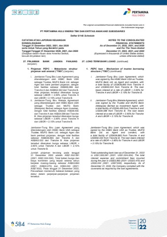 584 PT Pertamina Hulu Energi 2022Laporan TahunanAnnual ReportThe original consolidated financial statements included herein are in the Indonesian language.PT PERTAMINA HULU ENERGI TBK DAN ENTITAS ANAK/AND SUBSIDIARIES Daftar 5/145 ScheduleCATATAN ATAS LAPORAN KEUANGANKONSOLIDASIANTanggal 31 Desember 2022, 2021, dan 2020serta Untuk Tahun yang Berakhir padaTanggal-Tanggal 31 Desember 2020, 2021, dan 2020(Disajikan dalam ribuan dolar Amerika Serikat, kecuali dinyatakan lain)NOTES TO THE CONSOLIDATEDFINANCIAL STATEMENTSAs of December 31, 2022, 2021, and 2020and For The Years Ended December 31, 2022, 2021, and 2020 (Expressed in thousands of United States dollars,unless otherwise stated)27. PINJAMAN BANK JANGKA PANJANG (lanjutan)27. LONG TERM BANK LOANS (continued)1. Pinjaman PEPC - Mekanisme struktur pinjaman wali amanat (%u201cTBS%u201d) (lanjutan)1. PEPC loan - Mechanism of trustee borrowing structure (%u201cTBS%u201d) (continued)i. Jambaran-Tiung Biru Loan Agreement yang ditandatangani oleh HSBC Bank USA sebagai Trustee, MUFG Bank Ltd. sebagai Agen dan bank pemberi pinjaman, dengan total fasilitas sebesar AS$636.865 dari Tranche A dan AS$952.022 dari Tranche B. Atas pinjaman tersebut dikenakan bunga sebesar LIBOR + 2,95% untuk Tranche A dan LIBOR + 2,15% untuk Tranche B.i. Jambaran-Tiung Biru Loan Agreement, which was signed by the HSBC Bank USA as Trustee, MUFG Bank Ltd. as Agent and Lenders, with a total facility of US$636,865 from Tranche A and US$952,022 from Tranche B. The loan bears interest at a rate of LIBOR + 2.95% for Tranche A and LIBOR + 2.15% for Tranche B.ii. Jambaran-Tiung Biru Wakala Agreement yang ditandatangani oleh HSBC Bank USA sebagai Trustee dan MUFG Bank (Malaysia) Berhad sebagai Agen Investasi, dengan total fasilitas sebesar AS$36.455 dari Tranche A dan AS$54.598 dari Tranche B. Atas pinjaman tersebut dikenakan bunga sebesar LIBOR + 2,95% untuk Tranche A dan LIBOR + 2,15% untuk Tranche B.ii. Jambaran-Tiung Biru Wakala Agreement, which was signed by the Trustee and MUFG Bank (Malaysia) Berhad as Investment Agent, with a total facility of US$36,455 from Tranche A and US$54,598 from Tranche B. The loan bears interest at a rate of LIBOR + 2.95% for Tranche A and LIBOR + 2.15% for Tranche B. Jambaran-Tiung Biru Loan Agreement yang ditandatangani oleh HSBC Bank USA sebagai Trustee, MUFG Bank Ltd. sebagai Agen dan bank pemberi pinjaman, dengan total fasilitas sebesar AS$636.865 dari Tranche A dan AS$952.022 dari Tranche B. Atas pinjaman tersebut dikenakan bunga sebesar LIBOR + 2,95% untuk Tranche A dan LIBOR + 2,15% untuk Tranche B. Jambaran-Tiung Biru Loan Agreement, which was signed by the HSBC Bank USA as Trustee, MUFG Bank Ltd. as Agent and Lenders, with a total facility of US$636,865 from Tranche A and US$952,022 from Tranche B. The loan bears interest at a rate of LIBOR + 2.95% for Tranche A and LIBOR + 2.15% for Tranche B.Jumlah pinjaman terutang pada tanggal 31 Desember 2022 adalah AS$1.552.091(2021: AS$1.024.024). Total beban bunga dan biaya komitmen yang terjadi selama tahun berjalan masing-masing sebesar AS$53.863 (2021: AS$22.470) dan AS$3.244 (2021: AS$7.932). Pada tanggal 31 Desember 2022, Perusahaan memenuhi batasan-batasan yang diatur dalam perjanjian-perjanjian pinjaman tersebut.Total outstanding bank loan as of December 31, 2022 is US$1,552,091 (2021: US$1,024,024). The total interest expense and commitment fees incurred during the year is US$53,863 (2021: US$22,470) and US$3,244 (2021: US$7,932), respectively. As of December 31, 2022, the Company complied with the covenants as required by the loan agreements.