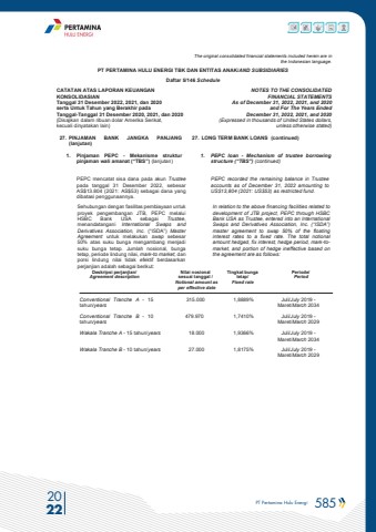 PT Pertamina Hulu Energi 585 2022The original consolidated financial statements included herein are in the Indonesian language.PT PERTAMINA HULU ENERGI TBK DAN ENTITAS ANAK/AND SUBSIDIARIES Daftar 5/146 ScheduleCATATAN ATAS LAPORAN KEUANGANKONSOLIDASIANTanggal 31 Desember 2022, 2021, dan 2020serta Untuk Tahun yang Berakhir padaTanggal-Tanggal 31 Desember 2020, 2021, dan 2020(Disajikan dalam ribuan dolar Amerika Serikat, kecuali dinyatakan lain)NOTES TO THE CONSOLIDATEDFINANCIAL STATEMENTSAs of December 31, 2022, 2021, and 2020and For The Years Ended December 31, 2022, 2021, and 2020 (Expressed in thousands of United States dollars,unless otherwise stated)27. PINJAMAN BANK JANGKA PANJANG (lanjutan)27. LONG TERM BANK LOANS (continued)1. Pinjaman PEPC - Mekanisme struktur pinjaman wali amanat (%u201cTBS%u201d) (lanjutan)1. PEPC loan - Mechanism of trustee borrowing structure (%u201cTBS%u201d) (continued)PEPC mencatat sisa dana pada akun Trusteepada tanggal 31 Desember 2022, sebesar AS$13.804 (2021: AS$53) sebagai dana yang dibatasi penggunaannya.PEPC recorded the remaining balance in Trustee accounts as of December 31, 2022 amounting to US$13,804 (2021: US$53) as restricted fund. Sehubungan dengan fasilitas pembiayaan untuk proyek pengembangan JTB, PEPC melalui HSBC Bank USA sebagai Trustee, menandatangani International Swaps and Derivatives Association, Inc. (%u201cISDA%u201d) Master Agreement untuk melakukan swap sebesar 50% atas suku bunga mengambang menjadi suku bunga tetap. Jumlah nosional, bunga tetap, periode lindung nilai, mark-to market, dan porsi lindung nilai tidak efektif berdasarkan perjanjian adalah sebagai berikut:In relation to the above financing facilities related to development of JTB project, PEPC through HSBC Bank USA as Trustee, entered into an International Swaps and Derivatives Association, Inc. (%u201cISDA%u201d) master agreement to swap 50% of the floating interest rates to a fixed rate. The total notional amount hedged, fix interest, hedge period, mark-tomarket, and portion of hedge ineffective based on the agreement are as follows:Deskripsi perjanjian/Agreement descriptionNilai nosional sesuai tanggal /Notional amount as per effective dateTingkat bunga tetap/Fixed ratePeriode/PeriodConventional Tranche A - 15 tahun/years315.000 1,8889% Juli/July 2019 -Maret/March 2034Conventional Tranche B - 10 tahun/years479.970 1,7410% Juli/July 2019 -Maret/March 2029Wakala Tranche A - 15 tahun/years 18.000 1,9366% Juli/July 2019 -Maret/March 2034Wakala Tranche B - 10 tahun/years 27.000 1,8175% Juli/July 2019 -Maret/March 2029