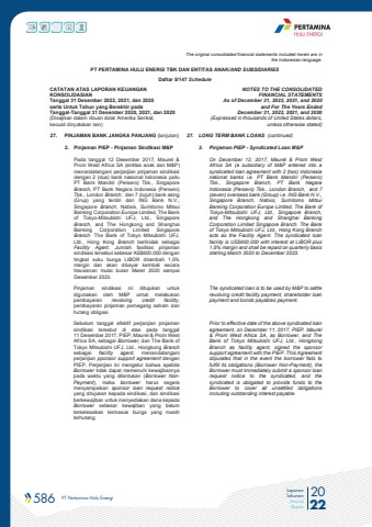 586 PT Pertamina Hulu Energi 2022Laporan TahunanAnnual ReportThe original consolidated financial statements included herein are in the Indonesian language.PT PERTAMINA HULU ENERGI TBK DAN ENTITAS ANAK/AND SUBSIDIARIES Daftar 5/147 ScheduleCATATAN ATAS LAPORAN KEUANGANKONSOLIDASIANTanggal 31 Desember 2022, 2021, dan 2020serta Untuk Tahun yang Berakhir padaTanggal-Tanggal 31 Desember 2020, 2021, dan 2020(Disajikan dalam ribuan dolar Amerika Serikat, kecuali dinyatakan lain)NOTES TO THE CONSOLIDATEDFINANCIAL STATEMENTSAs of December 31, 2022, 2021, and 2020and For The Years Ended December 31, 2022, 2021, and 2020 (Expressed in thousands of United States dollars,unless otherwise stated)27. PINJAMAN BANK JANGKA PANJANG (lanjutan) 27. LONG TERM BANK LOANS (continued)2. Pinjaman PIEP - Pinjaman Sindikasi M&PPada tanggal 12 Desember 2017, Maurel & Prom West Africa SA (entitas anak dari M&P) menandatangani perjanjian pinjaman sindikasi dengan 2 (dua) bank nasional Indonesia yaitu PT Bank Mandiri (Persero) Tbk., Singapore Branch, PT Bank Negara Indonesia (Persero) Tbk., London Branch, dan 7 (tujuh) bank asing (Grup) yang terdiri dari ING Bank N.V., Singapore Branch, Natixis, Sumitomo Mitsui Banking Corporation Europe Limited, The Bank of Tokyo-Mitsubishi UFJ, Ltd., Singapore Branch, and The Hongkong and Shanghai Banking Corporation Limited Singapore Branch. The Bank of Tokyo Mitsubishi UFJ, Ltd., Hong Kong Branch bertindak sebagai Facility Agent. Jumlah fasilitas pinjaman sindikasi tersebut sebesar AS$600.000 dengan tingkat suku bunga LIBOR ditambah 1,5% margin dan akan dibayar kembali secara triwulanan mulai bulan Maret 2020 sampai Desember 2023. 2. Pinjaman PIEP - Syndicated Loan M&POn December 12, 2017, Maurel & Prom West Africa SA (a subsidiary of M&P entered into a syndicated loan agreement with 2 (two) Indonesia national banks i.e. PT Bank Mandiri (Persero) Tbk., Singapore Branch, PT Bank Negara Indonesia (Persero) Tbk., London Branch, and 7 (seven) overseas bank (Group) i.e. ING Bank N.V., Singapore Branch, Natixis, Sumitomo Mitsui Banking Corporation Europe Limited, The Bank of Tokyo-Mitsubishi UFJ, Ltd., Singapore Branch, and The Hongkong and Shanghai Banking Corporation Limited Singapore Branch. The Bank of Tokyo Mitsubishi UFJ, Ltd., Hong Kong Branch acts as the Facility Agent. The syndicated loan facility is US$600,000 with interest at LIBOR plus 1.5% margin and shall be repaid on quarterly basis starting March 2020 to December 2023.Pinjaman sindikasi ini ditujukan untuk digunakan oleh M&P untuk melakukan pembayaran revolving credit facility, pembayaran pinjaman pemegang saham dan hutang obligasi.The syndicated loan is to be used by M&P to settle revolving credit facility payment, shareholder loan payment and bonds payables payment.Sebelum tanggal efektif perjanjian pinjaman sindikasi tersebut di atas pada tanggal 11 Desember 2017, PIEP, Maurel & Prom West Africa SA, sebagai Borrower, dan The Bank of Tokyo Mitsubishi UFJ, Ltd., Hongkong Branch sebagai facility agent, menandatangani perjanjian pponsor support agreement dengan PIEP. Perjanjian ini mengatur bahwa apabila Borrower tidak dapat memenuhi kewajibannya pada waktu yang ditentukan (Borrower NonPayment), maka borrower harus segera menyampaikan sponsor loan request noticeyang ditujukan kepada sindikasi, dan sindikasi berkewajiban untuk menyediakan dana kepada Borrower sebesar kewajiban yang belum terselesaikan termasuk bunga yang masih terhutang.Prior to effective date of the above syndicated loan agreement, on December 11, 2017, PIEP, Maurel & Prom West Africa SA, as Borrower, and The Bank of Tokyo Mitsubishi UFJ, Ltd., Hongkong Branch as facility agent, signed the sponsor support agreement with the PIEP. This Agreement stipulates that in the event the borrower fails to fulfill its obligations (Borrower Non-Payment), the Borrower must immediately submit a sponsor loan request notice to the syndicated, and the syndicated is obligated to provide funds to the Borrower to cover all unsettled obligations including outstanding interest payable.