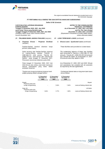 PT Pertamina Hulu Energi 589 2022The original consolidated financial statements included herein are in the Indonesian language.PT PERTAMINA HULU ENERGI TBK DAN ENTITAS ANAK/AND SUBSIDIARIES Daftar 5/150 ScheduleCATATAN ATAS LAPORAN KEUANGANKONSOLIDASIANTanggal 31 Desember 2022, 2021, dan 2020serta Untuk Tahun yang Berakhir padaTanggal-Tanggal 31 Desember 2020, 2021, dan 2020(Disajikan dalam ribuan dolar Amerika Serikat, kecuali dinyatakan lain)NOTES TO THE CONSOLIDATEDFINANCIAL STATEMENTSAs of December 31, 2022, 2021, and 2020and For The Years Ended December 31, 2022, 2021, and 2020 (Expressed in thousands of United States dollars,unless otherwise stated)27. PINJAMAN BANK JANGKA PANJANG (lanjutan) 27. LONG TERM BANK LOANS (continued)3. Pinjaman Elnusa - Pinjaman Sindikasi(lanjutan)3. Elnusa Loans - Syndicated Loans (continued)Fasilitas-fasilitas tersebut diberikan tanpa jaminan (clean-basis).These facilities were provided on a clean-basis.Saldo terutang atas fasilitas-fasilitas pinjaman ini masing-masing sebesar Tranche A: AS$1.962.121 (nilai penuh), Tranche B1: AS$9.722.222 (nilai penuh) dan Tranche B2: RpNihil pada tanggal 31 Desember 2021. Pelunasan seluruhnya dilakukan pada 2022.The outstanding balance of these loan facilities each amounted to Tranche A: US$1,962,121 (full amount), Tranche B1: US$9,722,222 (full amount) and Tranche B2: RpNil as of December 31, 2021.All amounts were fully repaid in 2022. Pada tanggal 31 Desember 2020, 2021 dan 2022 Elnusa dan entitas anak telah memenuhi seluruh pembatasan yang diatur dalam perjanjian pinjaman.As of December 31, 2020, 2021 and 2022 Elnusa and subsidiaries has complied with all covenants as required by the loan agreements.Tingkat suku bunga kontraktual pinjaman bank jangka panjang adalah sebagai berikut:Contractual interest rates on long-term bank loans are as follows: 31 Desember/ 31 Desember/ 31 Desember/ December 31, December 31, December 31, 2022 2021 2020 Rupiah RupiahPinjaman pada suku bunga mengambang - 7,50% 7,50% Loans at floating interest rateDolar AS US DollarPinjaman pada suku bunga mengambang 1,85% 1,77% 1,83% Loans at floating interest rate