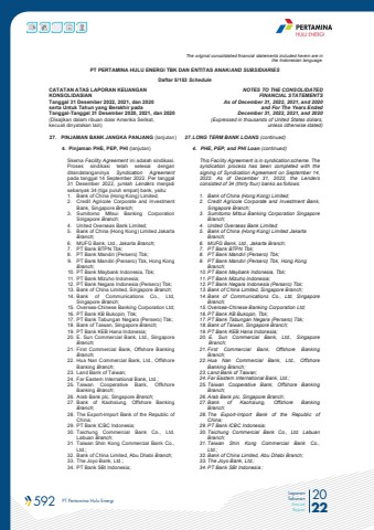 592 PT Pertamina Hulu Energi 2022Laporan TahunanAnnual ReportThe original consolidated financial statements included herein are in the Indonesian language.PT PERTAMINA HULU ENERGI TBK DAN ENTITAS ANAK/AND SUBSIDIARIES Daftar 5/153 ScheduleCATATAN ATAS LAPORAN KEUANGANKONSOLIDASIANTanggal 31 Desember 2022, 2021, dan 2020serta Untuk Tahun yang Berakhir padaTanggal-Tanggal 31 Desember 2020, 2021, dan 2020(Disajikan dalam ribuan dolar Amerika Serikat, kecuali dinyatakan lain)NOTES TO THE CONSOLIDATEDFINANCIAL STATEMENTSAs of December 31, 2022, 2021, and 2020and For The Years Ended December 31, 2022, 2021, and 2020 (Expressed in thousands of United States dollars,unless otherwise stated)27. PINJAMAN BANK JANGKA PANJANG (lanjutan) 27.LONG TERM BANK LOANS (continued)4. Pinjaman PHE, PEP, PHI (lanjutan) 4. PHE, PEP, and PHI Loan (continued)Skema Facility Agreement ini adalah sindikasi. Proses sindikasi telah selesai dengan ditandatanganinya Syndication Agreementpada tanggal 14 September 2022. Per tanggal 31 Desember 2022, jumlah Lenders menjadi sebanyak 34 (tiga puluh empat) bank, yaitu:1. Bank of China (Hong Kong) Limited; 2. Credit Agricole Corporate and Investment Bank, Singapore Branch; 3. Sumitomo Mitsui Banking Corporation Singapore Branch; 4. United Overseas Bank Limited; 5. Bank of China (Hong Kong) Limited Jakarta Branch; 6. MUFG Bank, Ltd., Jakarta Branch; 7. PT Bank BTPN Tbk; 8. PT Bank Mandiri (Persero) Tbk; 9. PT Bank Mandiri (Persero) Tbk, Hong Kong Branch; 10. PT Bank Maybank Indonesia, Tbk;11. PT Bank Mizuho Indonesia;12. PT Bank Negara Indonesia (Persero) Tbk;13. Bank of China Limited, Singapore Branch; 14. Bank of Communications Co., Ltd, Singapore Branch; 15. Oversea-Chinese Banking Corporation Ltd;16. PT Bank KB Bukopin, Tbk;17. PT Bank Tabungan Negara (Persero) Tbk;18. Bank of Taiwan, Singapore Branch; 19. PT Bank KEB Hana Indonesia;20. E. Sun Commercial Bank, Ltd., Singapore Branch; 21. First Commercial Bank, Offshore Banking Branch; 22. Hua Nan Commercial Bank, Ltd., Offshore Banking Branch; 23. Land Bank of Taiwan;24. Far Eastern International Bank, Ltd.; 25. Taiwan Cooperative Bank, Offshore Banking Branch; 26. Arab Bank plc, Singapore Branch; 27. Bank of Kaohsiung, Offshore Banking Branch; 28. The Export-Import Bank of the Republic of China; 29. PT Bank ICBC Indonesia;30. Taichung Commercial Bank Co., Ltd. Labuan Branch; 31. Taiwan Shin Kong Commercial Bank Co., Ltd.; 32. Bank of China Limited, Abu Dhabi Branch; 33. The Joyo Bank, Ltd.; 34. PT Bank SBI Indonesia;This Facility Agreement is in syndication scheme. The syndication process has been completed with the signing of Syndication Agreement on September 14, 2022. As of December 31, 2022, the Lenders consisted of 34 (thirty four) banks as follows:1. Bank of China (Hong Kong) Limited; 2. Credit Agricole Corporate and Investment Bank, Singapore Branch;3. Sumitomo Mitsui Banking Corporation Singapore Branch; 4. United Overseas Bank Limited;5. Bank of China (Hong Kong) Limited Jakarta Branch; 6. MUFG Bank, Ltd., Jakarta Branch; 7. PT Bank BTPN Tbk; 8. PT Bank Mandiri (Persero) Tbk; 9. PT Bank Mandiri (Persero) Tbk, Hong Kong Branch; 10. PT Bank Maybank Indonesia, Tbk;11. PT Bank Mizuho Indonesia;12. PT Bank Negara Indonesia (Persero) Tbk;13. Bank of China Limited, Singapore Branch;14. Bank of Communications Co., Ltd, Singapore Branch; 15. Oversea-Chinese Banking Corporation Ltd;16. PT Bank KB Bukopin, Tbk;17. PT Bank Tabungan Negara (Persero) Tbk;18. Bank of Taiwan, Singapore Branch; 19. PT Bank KEB Hana Indonesia;20. E. Sun Commercial Bank, Ltd., Singapore Branch; 21. First Commercial Bank, Offshore Banking Branch; 22. Hua Nan Commercial Bank, Ltd., Offshore Banking Branch;23. Land Bank of Taiwan;24. Far Eastern International Bank, Ltd.; 25. Taiwan Cooperative Bank, Offshore Banking Branch; 26. Arab Bank plc, Singapore Branch;27. Bank of Kaohsiung, Offshore Banking Branch; 28. The Export-Import Bank of the Republic of China; 29. PT Bank ICBC Indonesia;30. Taichung Commercial Bank Co., Ltd. Labuan Branch; 31. Taiwan Shin Kong Commercial Bank Co., Ltd.; 32. Bank of China Limited, Abu Dhabi Branch;33. The Joyo Bank, Ltd.;34. PT Bank SBI Indonesia ;