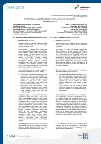 594 PT Pertamina Hulu Energi 2022Laporan TahunanAnnual ReportThe original consolidated financial statements included herein are in the Indonesian language.PT PERTAMINA HULU ENERGI TBK DAN ENTITAS ANAK/AND SUBSIDIARIES Daftar 5/155 ScheduleCATATAN ATAS LAPORAN KEUANGANKONSOLIDASIANTanggal 31 Desember 2022, 2021, dan 2020serta Untuk Tahun yang Berakhir padaTanggal-Tanggal 31 Desember 2020, 2021, dan 2020(Disajikan dalam ribuan dolar Amerika Serikat, kecuali dinyatakan lain)NOTES TO THE CONSOLIDATEDFINANCIAL STATEMENTSAs of December 31, 2022, 2021, and 2020and For The Years Ended December 31, 2022, 2021, and 2020 (Expressed in thousands of United States dollars,unless otherwise stated)27. PINJAMAN BANK JANGKA PANJANG (lanjutan) 27. LONG TERM BANK LOANS (continued)5. Pinjaman PDSI (lanjutan) 5. PDSI Loan (continued)Fasilitas pinjaman memiliki masa tenggangselama maksimal 12 (dua belas) bulan sejak tanggal perjanjian kredit. The loan facility has a grace period of a maximum of 12 (twelve) months from the date of the credit agreement.Pada tanggal 11 Oktober 2022, Perusahaan menandatangani Surat Penawaran Pemberian Kredit (%u201dSPPK%u201d) Fasilitas Term Loan dari Bank Mandiri selama 10 tahun dengan limit nilai fasilitas Rp546.094 juta (nilai penuh) (setara dengan AS$35.024). Sampai dengan 31 Desember 2022, Perusahaan telah mencairkan fasilitas pinjaman sebesar Rp220.000 juta (nilai penuh) (setara dengan AS$14.110). Sisa fasilitas pinjaman dapat dicairkan Perusahaan maksimal 12 (dua belas) bulan sejak tanggal perjanjian kredit.On October 11, 2022, the Company signed an Offering Letter for Credit Provision (%u201cSPPK%u201d) of Term Loan Facility from Bank Mandiri for 10 years with a facility value limit of Rp546,094 miliion (full amount) (equivalent to US$35,024). Up to December 31, 2022, the Company has drawn down the loan facility of Rp220,000 millions (full amount)(equivalent to US$14,110). The remaining loan facility can be obtained by the Company in a maximum of 12 (twelve) months from the date of the credit agreement.Jaminan fasilitas pinjaman adalah penjaminan negatif dengan ketentuan sebagai berikut:The guarantee for the loan facility is a negative pledge with the following conditions:a. Tidak dijamin secara khusus dengan aset Perusahaan, seluruh aset menjadi jaminan semua hutang Perusahaan kepada Bank Mandiri dan kreditur lainnya memiliki kedudukan yang sama tanpa adanya jaminan khusus atas utang tanpa hak preferen berdasarkan pari passu. b. Perusahaan tidak diperbolehkan untuk menyerahkan/meminjamkan aset kepada kreditur dan/atau lembaga keuangan lain untuk menjamin hutang yang telah ada maupun yang akan ada.a. Not specifically guaranteed by assets of the Company, all assets are collateral for all of the Company's debts to Bank Mandiri and other creditors have the same position without any special collateral for debts without preferential rights based on pari passu.b. The Company are not allowed to hand over/lend assets to creditors and/or other financial institutions to guarantee existing or future debts.Perjanjian pinjaman mensyaratkan beberapa pembatasan bagi Perusahaan, antara lain, untuk menggunakan fasilitas di luar tujuan penggunaan dalam perjanjian; menjaminkan harta kekayaannya kepada pihak lain (kecuali atas jaminan yang diizinkan); mengikatkan diri sebagai penanggung utang terhadap pihak lain; mengadakan penyertaan baru dalam perusahaan lain; mengadakan merger atau akuisisi; melakukan perubahan usaha dan bisnis di luar ketentuan; mengajukan permohonan kepada Pengadilan untuk dinyatakan pailit; serta menjual bagian signifikan dari aset utama jika melebihi batasan tertentu. Perusahaan juga diharuskan mempertahankan beberapa rasio keuangan tertentu.The credit agreement provides for several negative covenants for the Company, among others, to use the facility beyond the intended use in the agreement; to pledge its assets to other parties (except for permitted guarantees); to bind oneself as guarantor of debt to another party; to enter into a new investment in another company; to enter into mergers or acquisitions; to change the current course of its business; to apply to the Court to be declared bankrupt; to sell or dispose off significant portion of its assets used in the operations in excess of certain threshold. The Company is also required to maintain certain financial ratios.Pada tanggal 31 Desember 2022, Perusahaan telah memenuhi semua persyaratan pinjamanpinjaman jangka panjang tersebut di atas seperti disebutkan dalam perjanjian kredit.As of December 31, 2022, the Company has complied with all of the covenants of the abovementioned long-term loans as stipulated in the respective credit agreement.