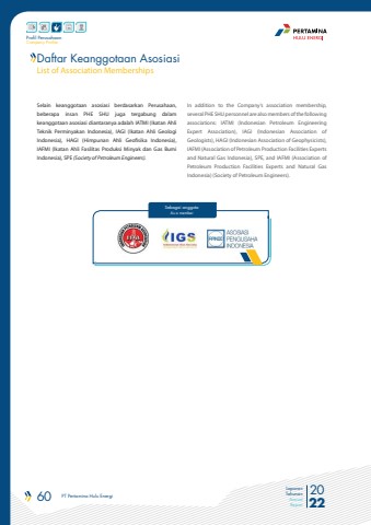 60 PT Pertamina Hulu Energi 2022Laporan TahunanAnnual ReportProfil PerusahaanCompany ProfileSelain keanggotaan asosiasi berdasarkan Perusahaan, beberapa insan PHE SHU juga tergabung dalam keanggotaan asosiasi diantaranya adalah IATMI (Ikatan Ahli Teknik Perminyakan Indonesia), IAGI (Ikatan Ahli Geologi Indonesia), HAGI (Himpunan Ahli Geofisika Indonesia), IAFMI (Ikatan Ahli Fasilitas Produksi Minyak dan Gas Bumi Indonesia), SPE (Society of Petroleum Engineers).In addition to the Company%u2019s association membership, several PHE SHU personnel are also members of the following associations: IATMI (Indonesian Petroleum Engineering Expert Association), IAGI (Indonesian Association of Geologists), HAGI (Indonesian Association of Geophysicists), IAFMI (Association of Petroleum Production Facilities Experts and Natural Gas Indonesia), SPE, and IAFMI (Association of Petroleum Production Facilities Experts and Natural Gas Indonesia) (Society of Petroleum Engineers).Sebagai anggotaAs a memberDaftar Keanggotaan AsosiasiList of Association Memberships