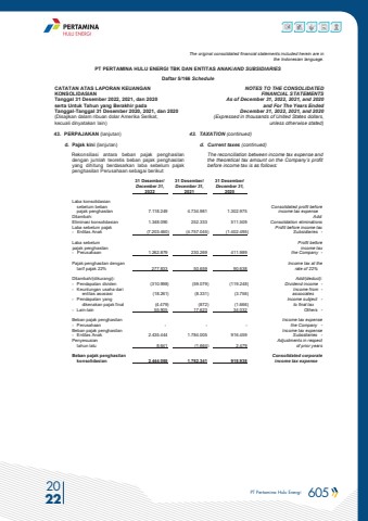 PT Pertamina Hulu Energi 605 2022The original consolidated financial statements included herein are in the Indonesian language.PT PERTAMINA HULU ENERGI TBK DAN ENTITAS ANAK/AND SUBSIDIARIES Daftar 5/166 ScheduleCATATAN ATAS LAPORAN KEUANGANKONSOLIDASIANTanggal 31 Desember 2022, 2021, dan 2020serta Untuk Tahun yang Berakhir padaTanggal-Tanggal 31 Desember 2020, 2021, dan 2020(Disajikan dalam ribuan dolar Amerika Serikat, kecuali dinyatakan lain)NOTES TO THE CONSOLIDATEDFINANCIAL STATEMENTSAs of December 31, 2022, 2021, and 2020and For The Years Ended December 31, 2022, 2021, and 2020 (Expressed in thousands of United States dollars,unless otherwise stated)43. PERPAJAKAN (lanjutan) 43. TAXATION (continued)d. Pajak kini (lanjutan) d. Current taxes (continued)Rekonsiliasi antara beban pajak penghasilan dengan jumlah teoretis beban pajak penghasilan yang dihitung berdasarkan laba sebelum pajak penghasilan Perusahaan sebagai berikut:The reconciliation between income tax expense and the theoretical tax amount on the Company%u2019s profit before income tax is as follows: 31 Desember/ 31 Desember/ 31 Desember/ December 31, December 31, December 31, 2022 2021 2020 Laba konsolidasian sebelum beban Consolidated profit before pajak penghasilan 7.118.249 4.734.981 1.302.975 income tax expenseDitambah: Add:Eliminasi konsolidasian 1.348.090 252.333 511.509 Consolidation eliminationsLaba sebelum pajak Profit before income tax- Entitas Anak (7.203.460) (4.757.045) (1.402.495) Subsidiaries -Laba sebelum Profit beforepajak penghasilan income tax- Perusahaan 1.262.879 230.269 411.989 the Company - Pajak penghasilan dengan Income tax at the tarif pajak 22% 277.833 50.659 90.638 rate of 22% Ditambah/(dikurangi): Add/(deduct):- Pendapatan dividen (310.998) (59.079) (119.248) Dividend income -- Keuntungan usaha dari Income from - entitas asosiasi (18.261) (8.331) (3.756) associates - Pendapatan yang Income subject - dikenakan pajak final (4.479) (872) (1.666) to final tax - Lain-lain 55.905 17.623 34.032 Others -Beban pajak penghasilan Income tax expense- Perusahaan - - - the Company -Beban pajak penghasilan Income tax expense- Entitas Anak 2.435.444 1.784.005 916.459 Subsidiaries -Penyesuaian Adjustments in respect tahun lalu 8.641 (1.664) 2.479 of prior yearsBeban pajak penghasilan Consolidated corporate konsolidasian 2.444.085 1.782.341 918.938 income tax expense