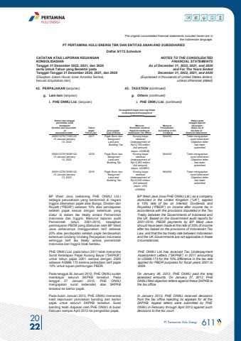PT Pertamina Hulu Energi 611 2022The original consolidated financial statements included herein are in the Indonesian language.PT PERTAMINA HULU ENERGI TBK DAN ENTITAS ANAK/AND SUBSIDIARIES Daftar 5/172 ScheduleCATATAN ATAS LAPORAN KEUANGANKONSOLIDASIANTanggal 31 Desember 2022, 2021, dan 2020serta Untuk Tahun yang Berakhir padaTanggal-Tanggal 31 Desember 2020, 2021, dan 2020(Disajikan dalam ribuan dolar Amerika Serikat, kecuali dinyatakan lain)NOTES TO THE CONSOLIDATEDFINANCIAL STATEMENTSAs of December 31, 2022, 2021, and 2020and For The Years Ended December 31, 2022, 2021, and 2020 (Expressed in thousands of United States dollars,unless otherwise stated)43. PERPAJAKAN (lanjutan) 43. TAXATION (continued)g. Lain-lain (lanjutan) g. Others (continued)i. PHE ONWJ Ltd. (lanjutan) i. PHE ONWJ Ltd. (continued)Kurang/lebih bayar atau rugi fiskalUnderpayment/Overpayment__________or fiscal loss__________BP West Java (sekarang PHE ONWJ Ltd.) sebagai perusahaan yang berdomisili di negara Inggris dikenakan pajak atas Bunga, Dividen dan Royalti (%u201cPBDR%u201d) sebesar 10% atas pendapatan setelah pajak sesuai dengan ketentuan yang diatur di dalam tax treaty antara Pemerintah Indonesia dan Inggris. Menurut laporan audit Pemerintah tahun 2001-2010, kewajiban pembayaran PBDR yang dilakukan oleh BP West Java seharusnya menggunakan tarif sebesar 20% atas pendapatan setelah pajak berdasarkan ketentuan Undang-Undang Perpajakan Indonesia sehingga tarif tax treaty antara pemerintah Indonesia dan Inggris tidak berlaku.BP West Java (now PHE ONWJ Ltd.) as a company domiciled in the United Kingdom (%u201cUK%u201d), applied a 10% rate of tax on Interest, Dividends and Royalties (%u201cPBDR%u201d) on income after income tax in accordance with the provisions stipulated in the Tax Treaty between the Governments of Indonesia and the UK. Based on the Government audit reports for 2001-2010, PBDR payments by BP West Java should have been made at the rate of 20% of income after tax based on the provisions of Indonesian Tax Law, and that the tax treaty rate between Indonesian and the UK Governments are not applicable in thesecircumstances.PHE ONWJ Ltd. pada tahun 2011 telah menerima Surat Ketetapan Pajak Kurang Bayar (%u201cSKPKB%u201d) untuk tahun pajak 2001 sampai dengan 2009 sebesar AS$66.173 karena perbedaan tarif pajak 10% untuk tujuan perhitungan PBDR.PHE ONWJ Ltd has received Tax Underpayment Assessment Letters (%u201cSKPKB%u201d) in 2011 amounting to US$66,173 for the 10% difference in the tax rate applied for PBDR purposes for fiscal years 2001 to 2009. Pada tanggal 26 Januari 2012, PHE ONWJ sudah membayar seluruh SKPKB tersebut. Pada tanggal 27 Januari 2012, PHE ONWJ mengajukan surat keberatan atas SKPKB tersebut ke kantor pajak. On January 26, 2012, PHE ONWJ paid the total assessed amounts. On January 27, 2012, PHE ONWJ filed objection letters against these SKPKB to the tax office.Pada bulan Januari 2013, PHE ONWJ menerima hasil keputusan penolakan banding dari kantor pajak untuk seluruh SKPKB tersebut. Surat banding telah diajukan oleh PHE ONWJ di bulan Februari sampai April 2013 ke pengadilan pajak.In January 2013, PHE ONWJ received decisions from the tax office rejecting its appeals for all the SKPKB. Appeal letters were submitted by PHE ONWJ in February through April 2013 against such decisions to the tax court. Nomor dan tanggal penerbitan surat ketetapan/Number and issue date ofassesment letterTahunpajak/Fiscal yearJenis pajak/ Type of taxesMenurutDirektorat Jenderal Pajak/According to Indonesian Tax OfficeMenurutPerusahaan/According to the CompanyStatus padatanggal laporankeuangan/ Status as ofthe date offinancial statements00001//276/17/081/2213 Januari/January13, 20222017 Pajak Bumi dan Bangunan/ Land and Building TaxKurang bayarsebesar/ Underpayment ofRp12,753 million (full amount)(equiv. US$818)Nihil/Nil Telah mengajukan surat keberatan/Objection letter has been submitted00001//276/18/081/2213 Januari/January13, 20222018 Pajak Bumi dan Bangunan/ Land and Building TaxKurang bayarsebesar/ Underpayment ofRp13,262 million (full amount)(equiv. US$851)Nihil/Nil Telah mengajukan surat keberatan/Objection letter has been submitted00001//276/19/081/2213 Januari/January13, 20222019 Pajak Bumi dan Bangunan/ Land and Building TaxKurang bayarsebesar/ Underpayment ofRp15,030 million (full amount)(equiv. US$ US$964)Nihil/Nil Telah mengajukan surat keberatan/Objection letter has been submitted