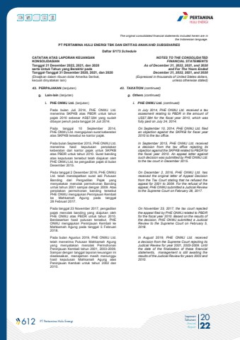 612 PT Pertamina Hulu Energi 2022Laporan TahunanAnnual ReportThe original consolidated financial statements included herein are in the Indonesian language.PT PERTAMINA HULU ENERGI TBK DAN ENTITAS ANAK/AND SUBSIDIARIES Daftar 5/173 ScheduleCATATAN ATAS LAPORAN KEUANGANKONSOLIDASIANTanggal 31 Desember 2022, 2021, dan 2020serta Untuk Tahun yang Berakhir padaTanggal-Tanggal 31 Desember 2020, 2021, dan 2020(Disajikan dalam ribuan dolar Amerika Serikat, kecuali dinyatakan lain)NOTES TO THE CONSOLIDATEDFINANCIAL STATEMENTSAs of December 31, 2022, 2021, and 2020and For The Years Ended December 31, 2022, 2021, and 2020 (Expressed in thousands of United States dollars,unless otherwise stated)43. PERPAJAKAN (lanjutan) 43. TAXATION (continued)g. Lain-lain (lanjutan) g. Others (continued)i. PHE ONWJ Ltd. (lanjutan) i. PHE ONWJ Ltd. (continued)Pada bulan Juli 2014, PHE ONWJ Ltd. menerima SKPKB atas PBDR untuk tahun pajak 2010 sebesar AS$7.584 yang sudah dibayar penuh pada tanggal 24 Juli 2014.In July 2014, PHE ONWJ Ltd. received a tax assesment relating to PBDR in the amount of US$7,584 for the fiscal year 2010, which was fully paid on July 24, 2014.Pada tanggal 10 September 2014, PHE ONWJ Ltd. mengajukan surat keberatan atas SKPKB tersebut ke kantor pajak.On September 10, 2014, PHE ONWJ Ltd. filed an objection against the SKPKB for fiscal year 2010 to the tax office.Pada bulan September 2015, PHE ONWJ Ltd. menerima hasil keputusan penolakan keberatan dari kantor pajak untuk SKPKB atas PBDR untuk tahun 2010. Surat banding atas keputusan tersebut telah diajukan oleh PHE ONWJ Ltd. ke pengadilan pajak di bulan Desember 2015.In September 2015, PHE ONWJ Ltd. received a decision from the tax office rejecting its objection against the SKPKB related to PBDR for the fiscal year 2010. An appeal letter against such decision was submitted by PHE ONWJ Ltd. to the tax court in December 2015.Pada tanggal 2 Desember 2016, PHE ONWJ Ltd. telah mendapatkan surat asli Putusan Banding dari Pengadilan Pajak yang menyatakan menolak permohonan Banding untuk tahun 2001 sampai dengan 2009. Atas penolakan permohonan banding tersebut PHE ONWJ mengajukan Peninjauan Kembali ke Mahkamah Agung pada tanggal 28 Februari 2017.On December 2, 2016, PHE ONWJ Ltd. has received the original letter of Appeal Decision from the Tax Court stating that he refused the appeal for 2001 to 2009. For the refusal of the appeal, PHE ONWJ submitted a Judicial Review to the Supreme Court on February 28, 2017.Pada tanggal 23 November 2017, pengadilan pajak menolak banding yang diajukan oleh PHE ONWJ atas PBDR untuk tahun 2010. Berdasarkan hasil putusan tersebut, PHE ONWJ mengajukan Peninjauan Kembali ke Mahkamah Agung pada tanggal 5 Februari 2018.On November 23, 2017, the tax court rejected the appeal filed by PHE ONWJ related to PBDR for the fiscal year 2010. Based on the results of the decision, PHE ONWJ submitted a Judicial Review to the Supreme Court on February 5, 2018.Pada bulan Agustus 2019, PHE ONWJ Ltd.telah menerima Putusan Mahkamah Agung yang menyatakan menolak Permohonan Peninjauan Kembali tahun 2001, 2003-2009. Sampai dengan tanggal laporan keuangan ini diselesaikan, manajemen masih menunggu hasil keputusan Mahkamah Agung atas Peninjauan Kembali untuk tahun 2002 dan 2010.In August 2019, PHE ONWJ Ltd. received a decision from the Supreme Court rejecting its Judicial Review for year 2001, 2003-2009. Until the date of the finalization of these financial statements, management is still awaiting the results of the Judicial Review for years 2002 and 2010.