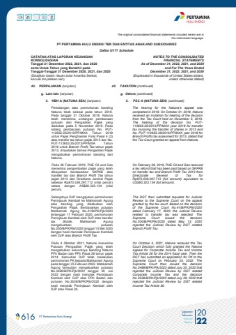 616 PT Pertamina Hulu Energi 2022Laporan TahunanAnnual ReportThe original consolidated financial statements included herein are in the Indonesian language.PT PERTAMINA HULU ENERGI TBK DAN ENTITAS ANAK/AND SUBSIDIARIES Daftar 5/177 ScheduleCATATAN ATAS LAPORAN KEUANGANKONSOLIDASIANTanggal 31 Desember 2022, 2021, dan 2020serta Untuk Tahun yang Berakhir padaTanggal-Tanggal 31 Desember 2020, 2021, dan 2020(Disajikan dalam ribuan dolar Amerika Serikat, kecuali dinyatakan lain)NOTES TO THE CONSOLIDATEDFINANCIAL STATEMENTSAs of December 31, 2022, 2021, and 2020and For The Years Ended December 31, 2022, 2021, and 2020 (Expressed in thousands of United States dollars,unless otherwise stated)43. PERPAJAKAN (lanjutan) 43. TAXATION (continued)g. Lain-lain (lanjutan) g. Others (continued)ii. KBH A (NATUNA SEA) (lanjutan) ii. PSC A (NATUNA SEA) (continued)Persidangan atas permohonan banding Natuna telah selesai pada tahun 2018. Pada tanggal 31 Oktober 2018, Natunatelah menerima undangan pembacaan putusan dari Pengadilan Pajak yang diadakan pada 5 November 2018. Pada sidang pembacaan putusan No. PUT112652.25/2013/PP/MXA Tahun 2018 untuk Pajak Penghasilan Final Pasal 4 (2) atas transfer tax tahun pajak 2013 dan No. PUT-112653.35/2013/PP/MXA Tahun 2018 untuk Branch Profit Tax tahun pajak 2013, dinyatakan bahwa Pengadilan Pajak mengabulkan permohonan banding dari Natuna.The hearing for the Natuna%u2019s appeal was completed in 2018. On October 31, 2018, Natunareceived an invitation for hearing of the decision from the Tax Court held on November 5, 2018. The hearing of the decision No. PUT112652.25/2013/PP/MXA year 2018 for transfer tax involving the transfer of shares in 2013 and No. PUT-112653.35/2013/PP/MXA year 2018 for Branch Profits tax assesment for 2013, stated that the Tax Court granted an appeal from Natuna.Pada 26 Februari 2019, PHE Oil and Gas menerima pengembalian pajak yang telah dibayarkan berdasarkan SKPKB atas transfer tax dan Branch Profit Tax tahun pajak 2013 dari Direktorat Jendral Pajak sebesar Rp873.539.297.712 (nilai penuh) setara dengan AS$60.323.134 (nilai penuh).On February 26, 2019, PHE Oil and Gas received a tax refund that has been paid based on SKPKB on transfer tax and Branch Profit Tax 2013 from Directorate General of Tax for Rp873,539,297,712 (full amount) equivalent to US$60,323,134 (full amount). Selanjutnya DJP mengajukan permohonan Peninjauan Kembali ke Mahkamah Agung atas banding yang dikabulkan oleh Pengadilan Pajak. Berdasarkan putusan Mahkamah Agung No.41/B/PK/Pjk/2020 tertanggal 17 Februari 2020, permohonan Peninjauan Kembali oleh DJP atas transfer tax ditolak. Mahkamah Agung mengeluarkan putusan No.200/B/PK/Pjk/2020 tanggal 13 Mei 2020 dengan hasil menolak Peninjauan Kembali oleh DJP atas Branch Profit Tax. The DGT then submitted requests for Judicial Review to the Supreme Court on the appeal granted by the tax court. Based on the decision of the Supreme Court No.41/B/PK/Pjk/2020 dated February 17, 2020, the Judicial Review related to transfer tax was rejected. The Supreme Court issued the decision No.200/B/PK/Pjk/2020 dated May 13, 2020 rejected the Judicial Review by DGT related Branch Profit Tax. Pada 4 Oktober 2021, Natuna menerima Putusan Pengadilan Pajak yang telah mengabulkan seluruhnya Banding Natuna PPh Badan dan PPh Pasal 26 tahun pajak 2014. Kemudian DJP telah melakukan permohonan PK kepada Mahkamah Agung pada tanggal 25 Februari 2022. Mahkamah Agung kemudian mengeluarkan putusan No.3469/B/PK/Pjk/2022 tanggal 20 Juli 2022 dengan hasil menolak Peninjauan Kembali oleh DJP atas PPh Badan dan putusan No.3539/B/PK/Pjk/2022 dengan hasil menolak Peninjauan Kembali oleh DJP atas Pasal 26.On October 4, 2021, Natuna received the Tax Court Decision which fully granted the Natuna Appeal for Corporate Income Tax and Income Tax Article 26 for the 2014 fiscal year. Then the DGT has submitted an application for PK to the Supreme Court on February 25, 2022. The Supreme Court then issued the decision No.3469/B/PK/Pjk/2022 dated July 20, 2022 thatrejected the Judicial Review by DGT related Corporate Income Tax and the decision No.3539/B/PK/Pjk/2022 dated July 28, 2022 thatrejected the Judicial Review by DGT related Income Tax Article 26.