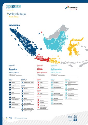 62 PT Pertamina Hulu Energi 2022Laporan TahunanAnnual ReportProfil PerusahaanCompany ProfileRegional 1Region 1Regional 3Region 3Regional 2Region 1Zona 1Zone 1Zona 8Zone 8Zona 9Zone 9Zona 5Zone 5Zona 7Zone 7Zona 6Zone 6Zona 2 - 3Zone 2 - 3Zona 10Zone 2 - 3Zona 4Zone 4Sumatra Java KalimantanArea 71.590 km2 Area 57.225 km2Regional Lead:PT Pertamina Hulu RokanRegional Lead:PT Pertamina Hulu IndonesiaRegional Lead:PT Pertamina EPArea 39.613 km2Sumatra JAWA KalimantanA68BC92 354DEI101115182930 313335363432 16 17202426272823212522FGJ KRS TULHMQNOP1A RantauB Pangkalan SusuC LirikD Jambi1 NSO2 Siak3 Kampar4 Jambi Merang5 Jabung6 West Gelagah7 Kakap20 Mahakam21 West Ganal22 East Sepinggan23 Sanga SangaM Sanga Sanga (PEP)N SangattaO Tanjung24 Maratua, Wartap15 ONWJ16 Abar17 AnggursiJ TambunK SubangL Jatibarang19 Blok Natuna A (Natuna Sea18 OSESE RambaF PrabumulihG PendopoH LimauI Adera9 Ogan Komering10 Raja Tempirai11 Corridor12 MNK Sakakemang13 MNK Sumbagut25 East Kalimantan AttakaP BunyuQ Sembakung26 Nunukan27 Simenggaris28 East Ambalat28 Ambalat8 Rokan North South19INDONESIAWilayah KerjaWork Areas