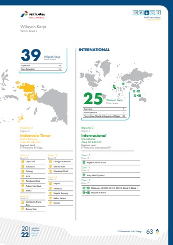PT Pertamina Hulu Energi 63 2022Laporan TahunanAnnual ReportProfil PerusahaanCompany ProfileWilayah KerjaWork AreasWilayah KerjaWork AreasRegional 3Region 3Regional 3Region 3Zona 11Zone 11Zona 15Zone 15Zona 16Zone 16Zona 17Zone 17Zona 13Zone 13Zona 14Zone 14Zona 12Zone 12East Indonesia InternationalArea 62.942 km2 Area 12.243 km2Regional Lead:PT Pertamina EP CepuRegional Lead:PT Pertamina International EPIndonesia Timur Internasional3739 403738VR Cepu PEPS SukowatiT Poleng29 ADK30 Randugunting31 Tuban East Java32 WMOU Donggi Matindok35 Senoro Tolli36 Makassar StraitV Papua37 Salawati38 Kepala Burung39 Babar Salaru33 40 Semai Jambaran Tiung Biru34 Banyu Urip41 Algeria : Block 450a42 Iraq : West Qurna-143 48 Malaysia : SK 309, SK 311, SK314, Block K, Block H49 67 Maurel et Prom3925INTERNATIONALOperator 24Non Operator 15Operator 1Non Operator 2Penyertaan Modal di Lapangan Migas 22Work AreasWilayah Kerja414243 4849 67