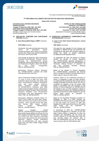 640 PT Pertamina Hulu Energi 2022Laporan TahunanAnnual ReportThe original consolidated financial statements included herein are in the Indonesian language.PT PERTAMINA HULU ENERGI TBK DAN ENTITAS ANAK/AND SUBSIDIARIES Daftar 5/201 ScheduleCATATAN ATAS LAPORAN KEUANGANKONSOLIDASIANTanggal 31 Desember 2022, 2021, dan 2020serta Untuk Tahun yang Berakhir padaTanggal-Tanggal 31 Desember 2020, 2021, dan 2020(Disajikan dalam ribuan dolar Amerika Serikat, kecuali dinyatakan lain)NOTES TO THE CONSOLIDATEDFINANCIAL STATEMENTSAs of December 31, 2022, 2021, and 2020and For The Years Ended December 31, 2022, 2021, and 2020 (Expressed in thousands of United States dollars,unless otherwise stated)45. PERJANJIAN, KOMITMEN DAN KONTINJENSI PENTING (lanjutan)45. SIGNIFICANT AGREEMENTS, COMMITMENTS AND CONTINGENCIES (continued)b. Sewa Barang Milik Negara (%u201cBMN%u201d) (lanjutan) b. Lease of the State Owned Enterprises%u2019s Assets (continued) PHE ONWJ (lanjutan) PHE ONWJ (continued)Pendekatan nilai wajar aset diperoleh antara lain melalui self assessment dengan mempertimbangkan faktor utilitas dan kapasitas produksi atau melalui hasil external assessmentoleh Kantor Jasa Penilai Publik.The asset fair value approach for the Company and Subsidiaries is obtained through self assessment with considering the utility factor and production capacity or through the results of external assessment by independent public appraisal service.Pada tanggal 28 September 2020, Kementerian Keuangan memberlakukan Peraturan Menteri Keuangan No. 140/PMK.06/2020 tentang Pengelolaan Barang Milik Negara yang Berasal dari Pelaksanaan Kegiatan Usaha Hulu Minyak dan Gas Bumi menggantikan PMK No. 89/PMK.06/2019.On September 28, 2020, the Ministry of Finance enacted the Minister of Finance Regulation No. 140/PMK.06/2020 regarding Management of State Assets Originating from the Implementation of Production Sharing Contract of Upstream Oil and Gas Business Activities replacing PMK No. 89/PMK.06/2019.Berdasarkan Peraturan Menteri Keuangan No. 140/PMK.06/2020, kontraktor alih kelola tidak lagi dikenakan sewa aset.Based on the Minister of Finance Regulation No. 140/PMK.06/2020, subsidiaries that received right to manage terminated oil and gas blocks are no longer subject to lease the State assets. Namun berdasarkan Ketentuan Peralihan Pasal171 ayat (1) huruf d PMK 140 Tahun 2020 disebutkan bahwa Kontraktor Alih Kelola yang belum menyelesaikan kewajiban pembayaran sewa aset sesuai dengan ketentuan dalam Peraturan Menteri Keuangan No 89/PMK.06/2019 dinyatakan tetap wajib melaksanakan kewajiban tersebut. Berdasarkan Ketentuan Peralihan tersebut, KKKS Alih Kelola berpotensi diwajibkan untuk menyelesaikan pembayaran sewa aset sebagaimana diatur dalam PMK No. 89/PMK.06/2019.However, based on the Transitional Provisions of Article 171 paragraph (1) letter d of PMK 140/2020, it is stated that the subsidiaries that received right to manage terminated oil and gas blocks who has not completed the obligation to pay the leased State assets in accordance with the provisions in the Minister of Finance Regulation No. 89/PMK.06/2019still obliged to carry out these obligations. Based on the Transitional Provisions, the Transferred KKKS will potentially be required to settle obligations to pay the leased State assets as stipulated in PMK No. 89/PMK.06/2019.Berdasarkan Ketentuan Peralihan Pasal 171 ayat (1) huruf d PMK 140 Tahun 2020, entitasentitas alih kelola atas wilayah kerja yang telah terminasi, masih mencatat akrual atas sewa aset Barang Milik Negara tersebut sampai dengan diberlakukannya PMK No. 140/PMK.06/2020.Based on the Transitional Provisions of Article 171 paragraph (1) letter d of PMK 140/2020, the subsidiaries that received right to manage terminated oil and gas blocks will continue to fulfill their Obligations and still record the accrual on the leased State assets until the enactment of PMK No. 140/PMK.06/2020.Dengan mengacu kepada PMK No. 140/PMK.06/2020 tentang Pengelolaan Barang Milik Negara (BMN) Hulu Minyak dan Gas Bumi tanggal 28 September 2020, Perusahaan dan Entitas Anak tidak melakukan pembatalan saldo provisi atas estimasi nilai sewa yang telah dibukukan sebelum tanggal keberlakuan PMK No.140/PMK/2020 dan tidak mencatat provisi atas nilai sewa setelah tanggal berlaku PMK tersebut.In accordance to PMK No. 140/PMK.06/2020 concerning Management of Upstream Oil and Gas State Property (BMN) on September 28, 2020, the Company and Subsidiaries did not cancel the provision balance for the estimated lease value that was recorded before the effective date of PMK No.140/PMK/2020 and did not record lease value provisions after the PMK effective date.