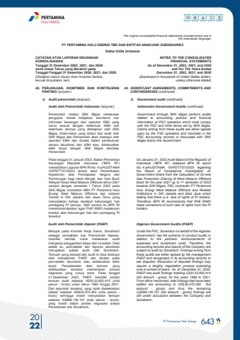 PT Pertamina Hulu Energi 643 2022The original consolidated financial statements included herein are in the Indonesian language.PT PERTAMINA HULU ENERGI TBK DAN ENTITAS ANAK/AND SUBSIDIARIES Daftar 5/204 ScheduleCATATAN ATAS LAPORAN KEUANGANKONSOLIDASIANTanggal 31 Desember 2022, 2021, dan 2020serta Untuk Tahun yang Berakhir padaTanggal-Tanggal 31 Desember 2020, 2021, dan 2020(Disajikan dalam ribuan dolar Amerika Serikat, kecuali dinyatakan lain)NOTES TO THE CONSOLIDATEDFINANCIAL STATEMENTSAs of December 31, 2022, 2021, and 2020and For The Years Ended December 31, 2022, 2021, and 2020 (Expressed in thousands of United States dollars,unless otherwise stated)45. PERJANJIAN, KOMITMEN DAN KONTINJENSI PENTING (lanjutan)45. SIGNIFICANT AGREEMENTS, COMMITMENTS AND CONTINGENCIES (continued)d. Audit pemerintah (lanjutan) d. Government audit (continued) Audit oleh Pemerintah Indonesia (lanjutan) Indonesian Government Audits (continued)Pemerintah melalui SKK Migas melakukan pengujian terkait kebijakan akuntansi dan informasi keuangan dari operator KBH yang harus sesuai dengan ketentuan KBH dan ketentuan lainnya yang ditetapkan oleh SKK Migas. Klaim-klaim yang timbul dari audit oleh SKK Migas dan Pemerintah akan disetujui oleh operator KBH dan dicatat dalam pembukuan secara akuntansi dari KBH atau didiskusikan lebih lanjut dengan SKK Migas dan/atau Pemerintah.Government through SKK Migas perform audits related to accounting policies and financial information of PSC operators which must comply with the PSC and other terms set by SKK Migas. Claims arising from these audits are either agreed upon by the PSC operators and recorded in the PSC accounting records or discussed with SKK Migas and/or the Government.Pada tanggal 31 Januari 2023, Badan Pemeriksa Keuangan Republik Indonesia (%u201cBPK RI%u201d) menerbitkan Laporan BPK RI No. 4.a/AUDITAMA VII/PDTT/01/2023 terkait Hasil Pemeriksaan Kepatuhan atas Pendapatan Negara dari Perhitungan bagi Hasil Minyak dan Gas Bumi Wilayah Kerja West Madura Offshore tahun 2021 sampai dengan semester I Tahun 2022 pada SKK Migas, kontraktor KBH PT Pertamina Hulu Energi West Madura Offshore dan Instansi Terkait di DKI Jakarta dan Jawa Timur yang menyatakan bahwa terdapat kekurangan hak pemegang PI lainnya. Oleh karena itu BPK RI merekomendasikan agar PHE WMO melakukan koreksi atas kekurangan hak dari pemegang PI tersebut.On January 31, 2023 Audit Board of the Republic of Indonesia (%u201cBPK RI%u201d) released BPK RI report No. 4.a/AUDITAMA VII/PDTT/01/2023 regarding the Result of Compliance Investigation on Government Share from the Calculation of Oil and Gas Production Sharing of West Madura Offshore block for the year 2021 up to 1st semester of 2022 towards SKK Migas, PSC contractor PT Pertamina Hulu Energi West Madura Offshore and Related Institutions in DKI Jakarta and East Java which stating that there is a lack of rights of PI holders. Therefore, BPK RI recommends that PHE WMO make corrections of such lack of rights from the PI holders. Audit oleh Pemerintah Aljazair (PAEP) Algerian Government Audits (PAEP)Merujuk pada Kontrak Kerja Sama, Sonatrach sebagai perwakilan dari Pemerintah Aljazair, memiliki otoritas untuk melakukan audit mengenai penggantian biaya dan investasi. Oleh sebab itu, pencatatan dan laporan akuntansi merupakan subjek audit oleh Sonatrach. Temuan yang berasal dari audit ini bisa disetujui oleh manajemen PAEP dan dicatat pada pencatatan akuntansi atau didiskusikan lebih lanjut. Penyelesaian atas temuan yang didiskusikan tersebut memerlukan proses negosiasi yang cukup lama. Pada tanggal 31 Desember 2022, PAEP memiliki jumlah temuan audit sebesar AS$133.605.414 (nilai penuh - bruto) untuk tahun 1995 hingga 2021. Dari sejumlah tersebut, yang telah diselesaikan adalah sebesar AS$35.475.263 (nilai penuh - bruto) sehingga masih menyisakan temuan sebesar AS$98.130.151 (nilai penuh - bruto). yang masih dalam proses negosiasi antara Perusahaan dan Sonatrach.Under the PSC, Sonatrach on behalf of the Algerian Government, has the authority to conduct audits in relation to the partners%u2019 reimbursements of expenses and investment costs. Therefore, the accounting records and reports of the Company are subject to audit by Sonatrach. Findings arising from these audits are either agreed by the managementPAEP and recognized in its accounting records or are disputed. Resolution of disputed findings may require a lengthy negotiation process extending over a number of years. As of December 31, 2022, PAEP has audit findings totalling US$133,605,414(full amount - gross) for the years 1995 to 2021. From afore mentioned, total findings that have been settled are amounting to US$35,475,263 (full amount - gross) and thus the remaining US$98,130,151 (full amount - gross) findings are still under discussion between the Company and Sonatrach.